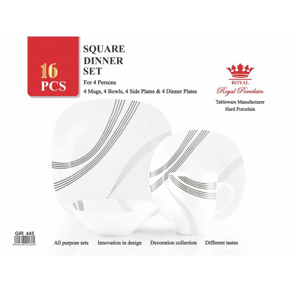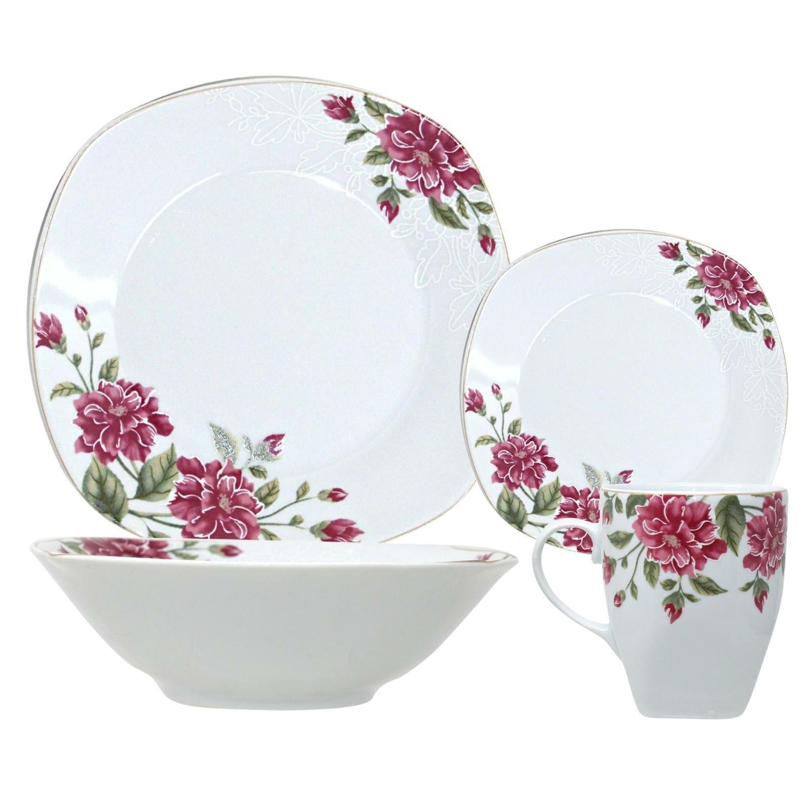 •Serve delicious meals with this complete soft square dinner set. Crafted from white porcelain with either a colourful, modern, floral or vintage pattern is this 16 piece dinner set including dinner plates, side plates, bowls, and mugs to complete breakfast, lunch, dinner, or any other food setting for 4!