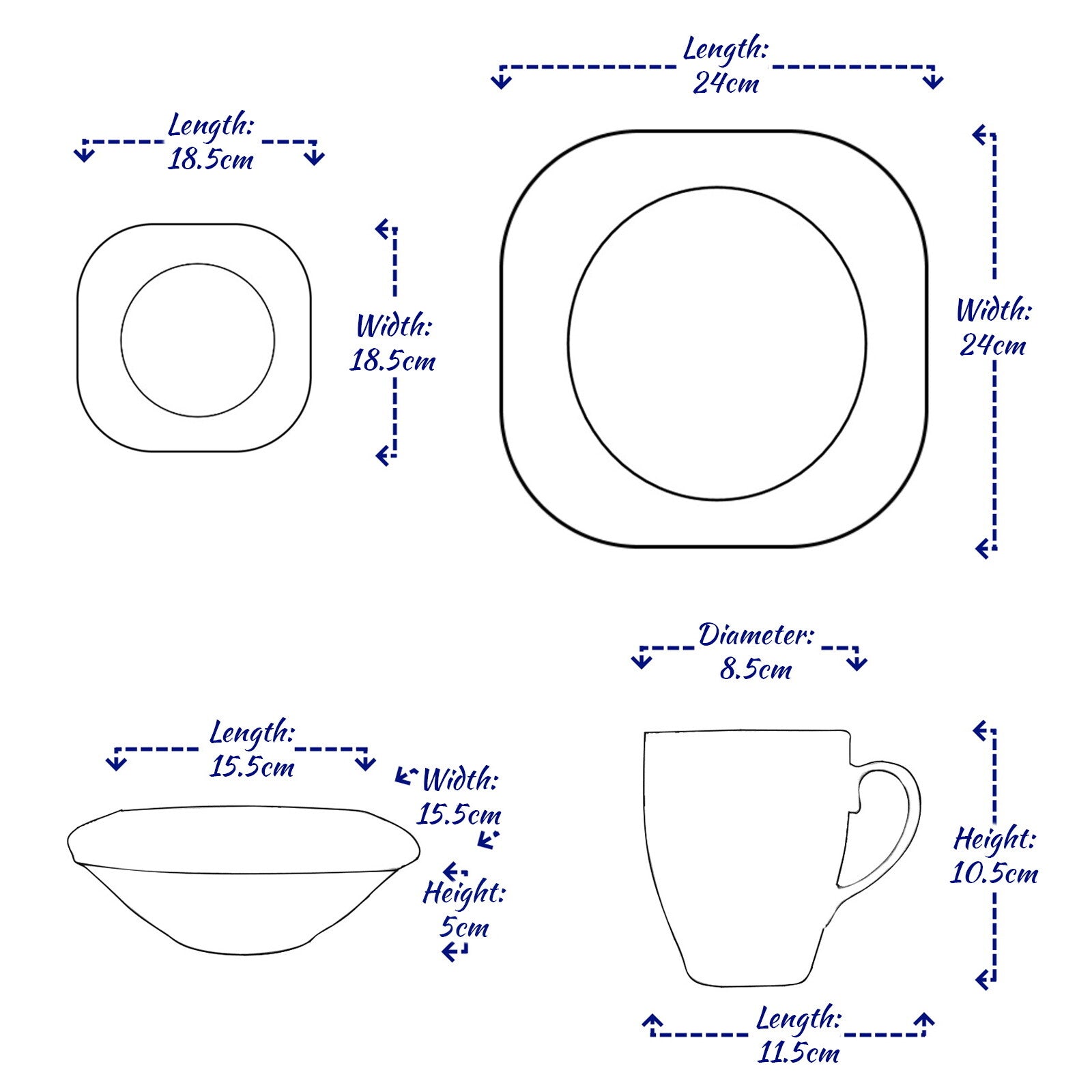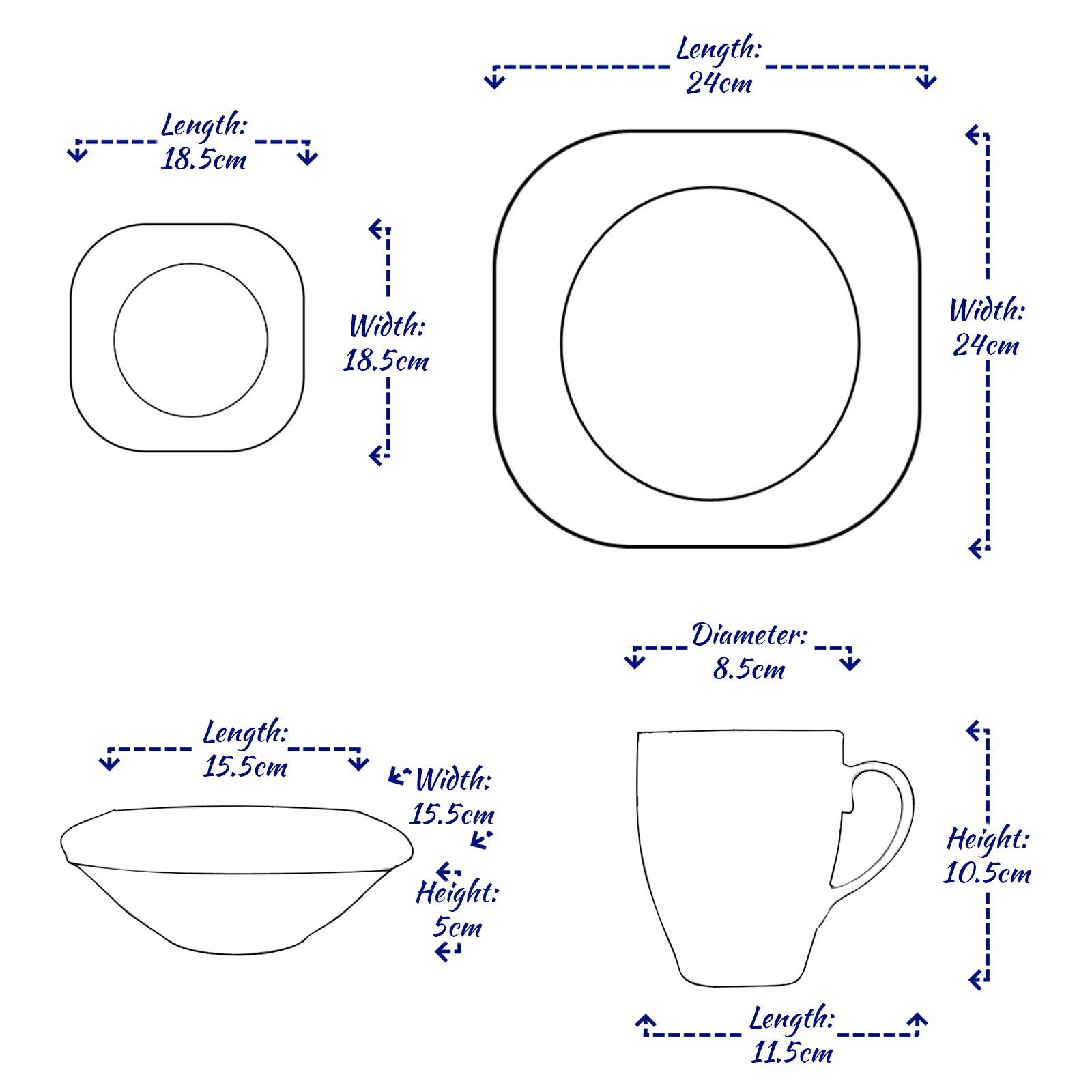 Each dinner set consists of - 4 x 380ml Mugs (Height: 10.5cm, Length: 11.5cm, Diameter: 8.5cm), 4 x Bowls (Height: 5cm, Length & Width: 15.5cm), 4 x Side Plates (Length & Width: 18.5cm) and 4 x Dinner Plates (Length & Width: 24cm).