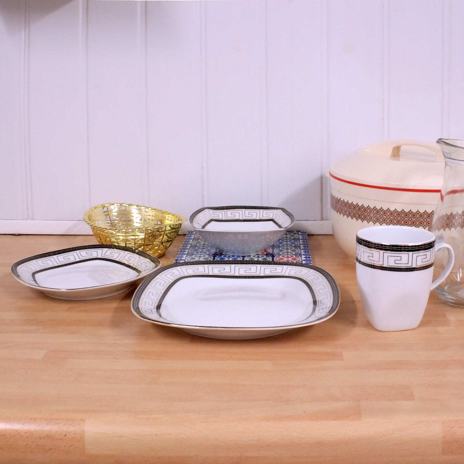 This 16-Piece Square Dinner Set is available in 4 DIFFRENT PATTERNS - Vintage Gold, Black Grey Stripe, Pink Floral and Black Gold Aztec.