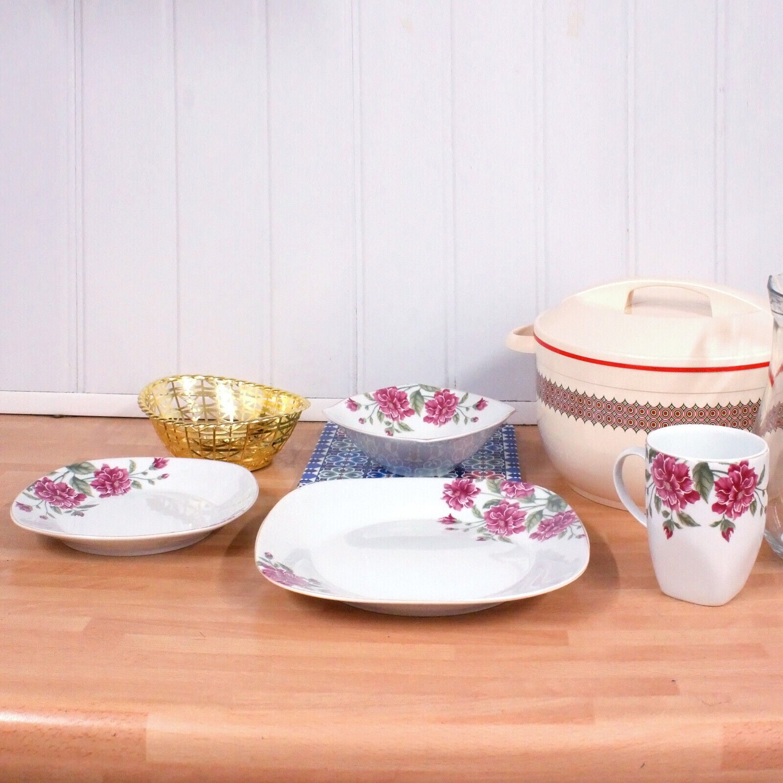 Serve delicious meals with this complete soft square dinner set. Crafted from white porcelain with either a colourful, modern, floral or vintage pattern is this 16 piece dinner set including dinner plates, side plates, bowls, and mugs to complete breakfast, lunch, or dinner setting for 4!