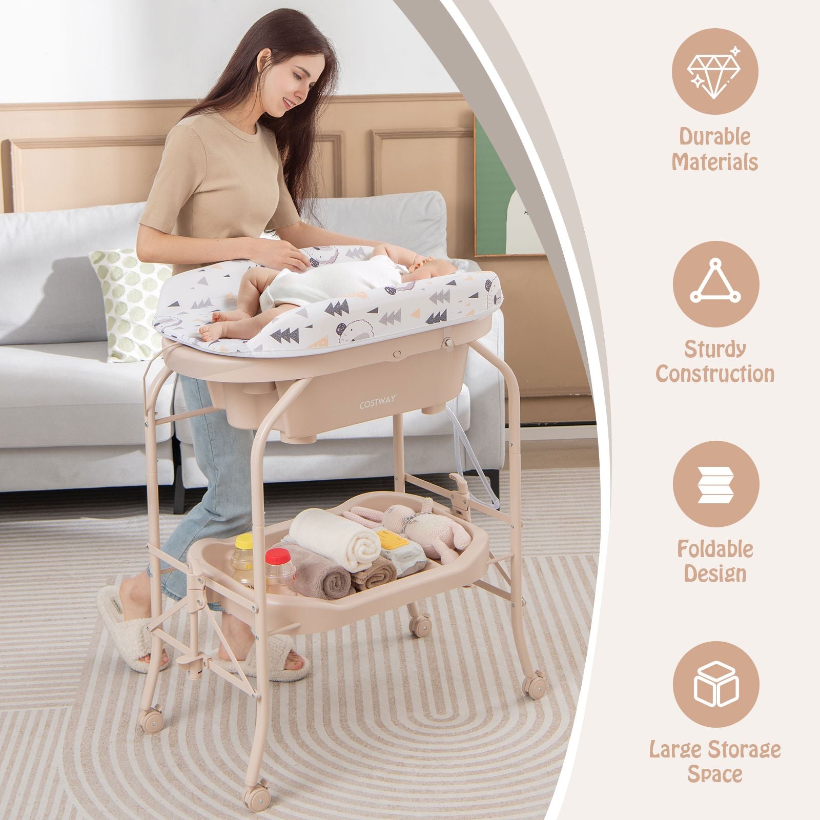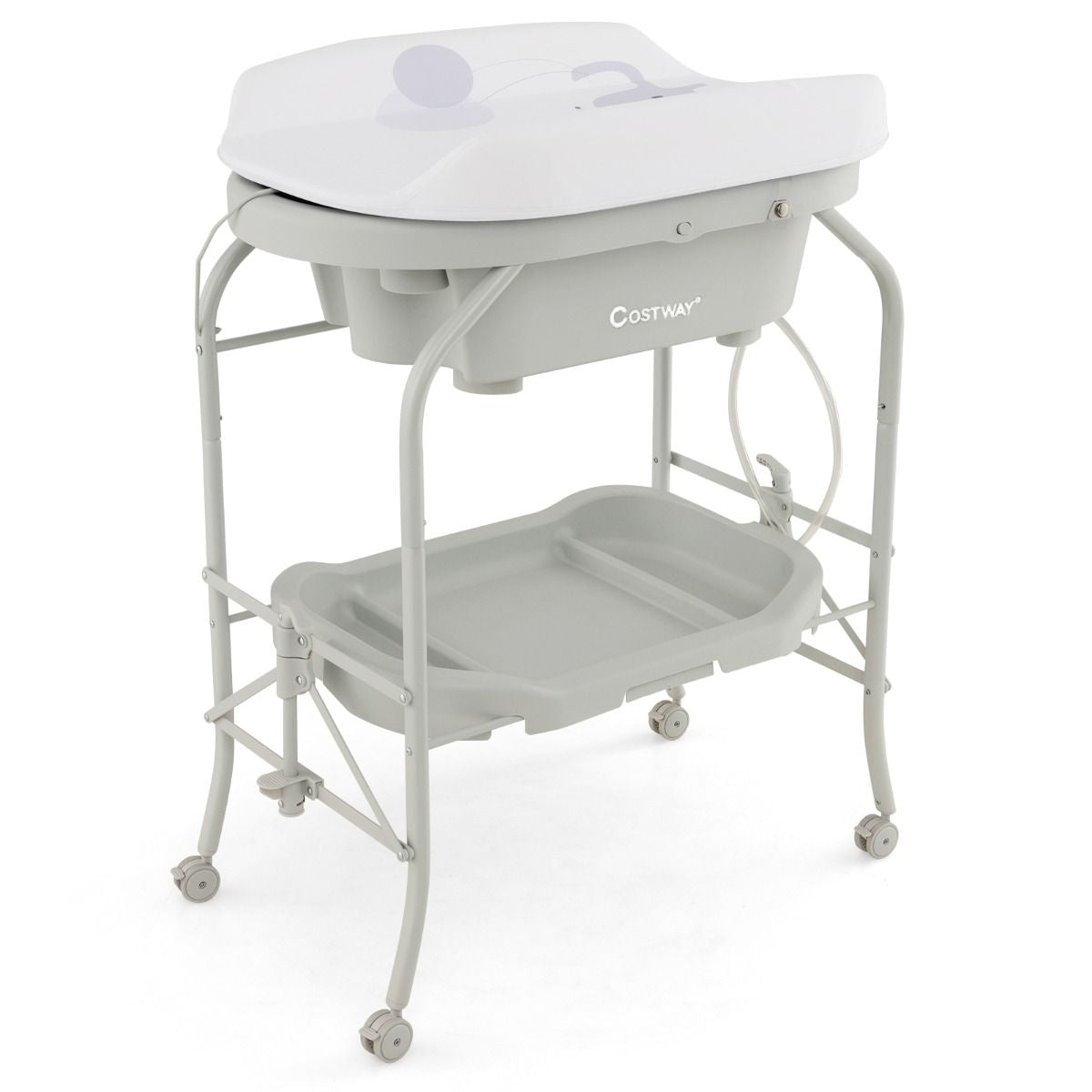 With a practical bathtub, this baby changing station is designed for versatility. It is suitable whether you use it to change diapers for your baby or bathe your baby. And the storage slots as well as the storage basket will hold baby's essentials for easy access. In addition, the reasonable height can effectively relieve your back pains from bending too much. Also, the thoughtful drainage system makes water drainage an easier thing. Most importantly, the selected materials that have passed ASTM and CPSIA certifications ensure reliability and security. When you do not need to use it, you can fold the diaper changing station and store it in the corner to save space.