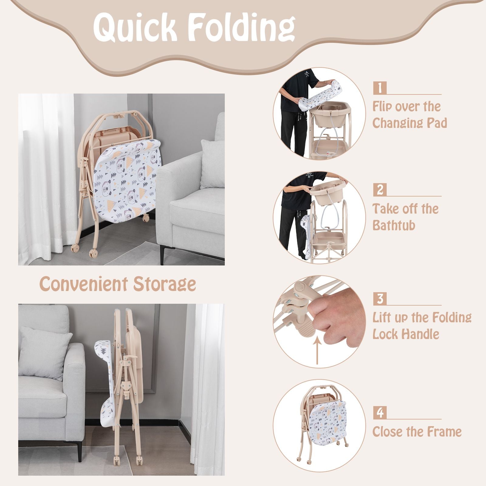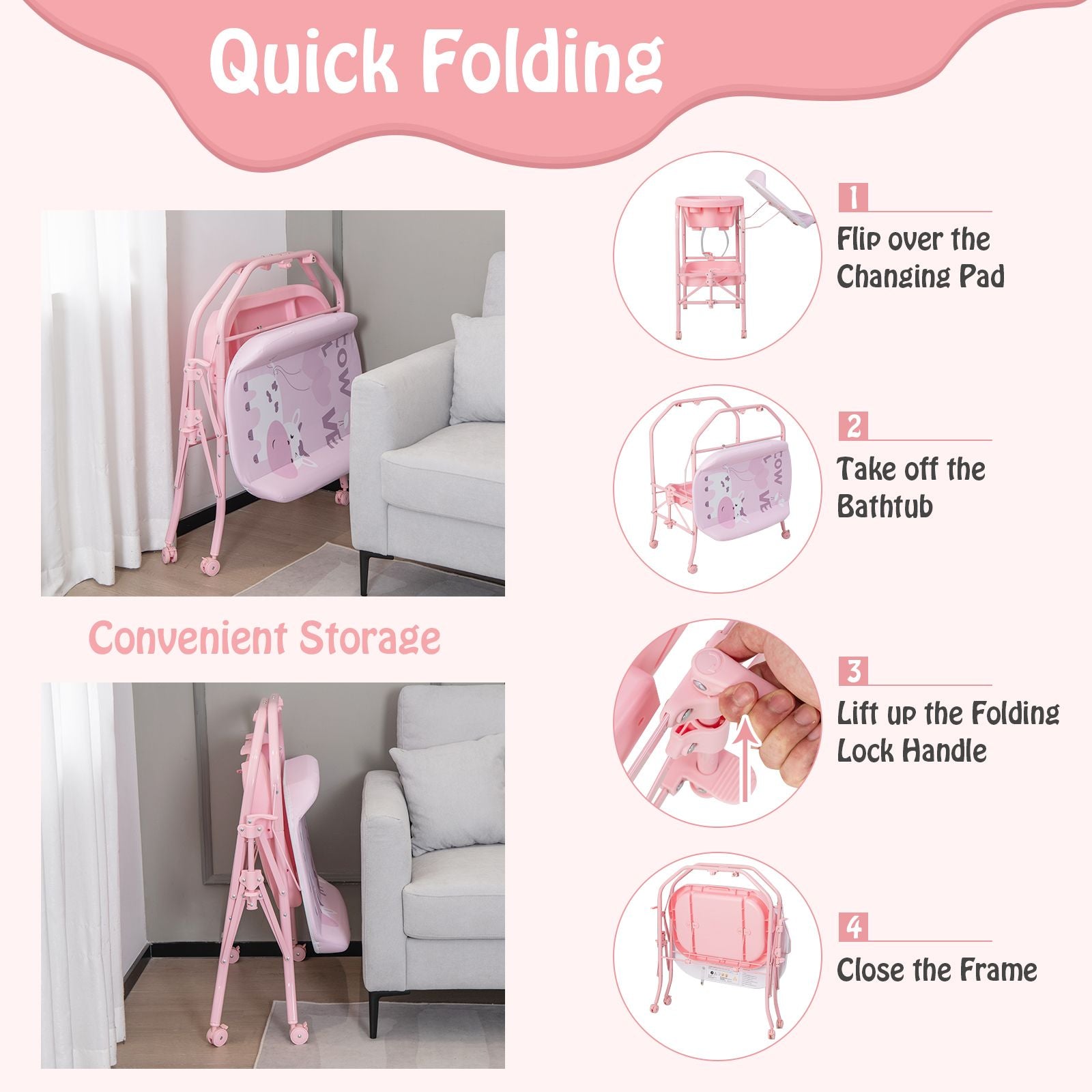 Movable and Foldable Design: The diaper changing station is equipped with 4 universal wheels that will help move it from one place to another easily. Also, all 4 wheels can be locked for extra stability and safety. What's more, you can fold the diaper changing station within several steps for convenient storage.