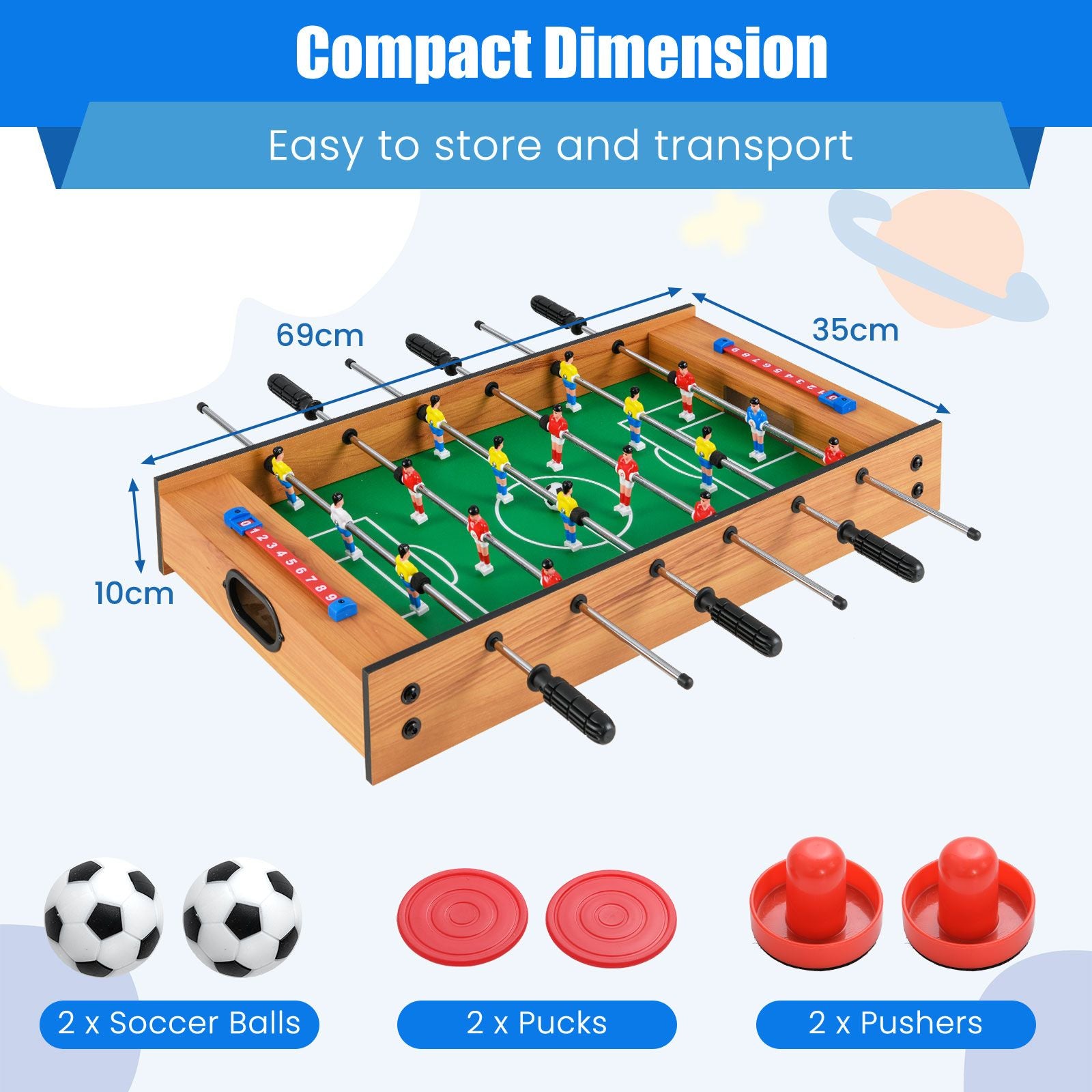Bring the thrill of the arcade into your home with this combo game table! This 2 in 1 tabletop game table allows you to quickly switch between foosball and hockey, making it an excellent choice for versatile gaming action. Measuring 69 cm, it is compact enough to fit into any space while being light enough to move easily. This complete combo game set including 2 soccer balls, 2 pushers and 2 pucks is crafted to engage players of all ages. Whether you're hosting a party, spending a family night at home or having a break at the office, this combo game table is a fabulous addition.