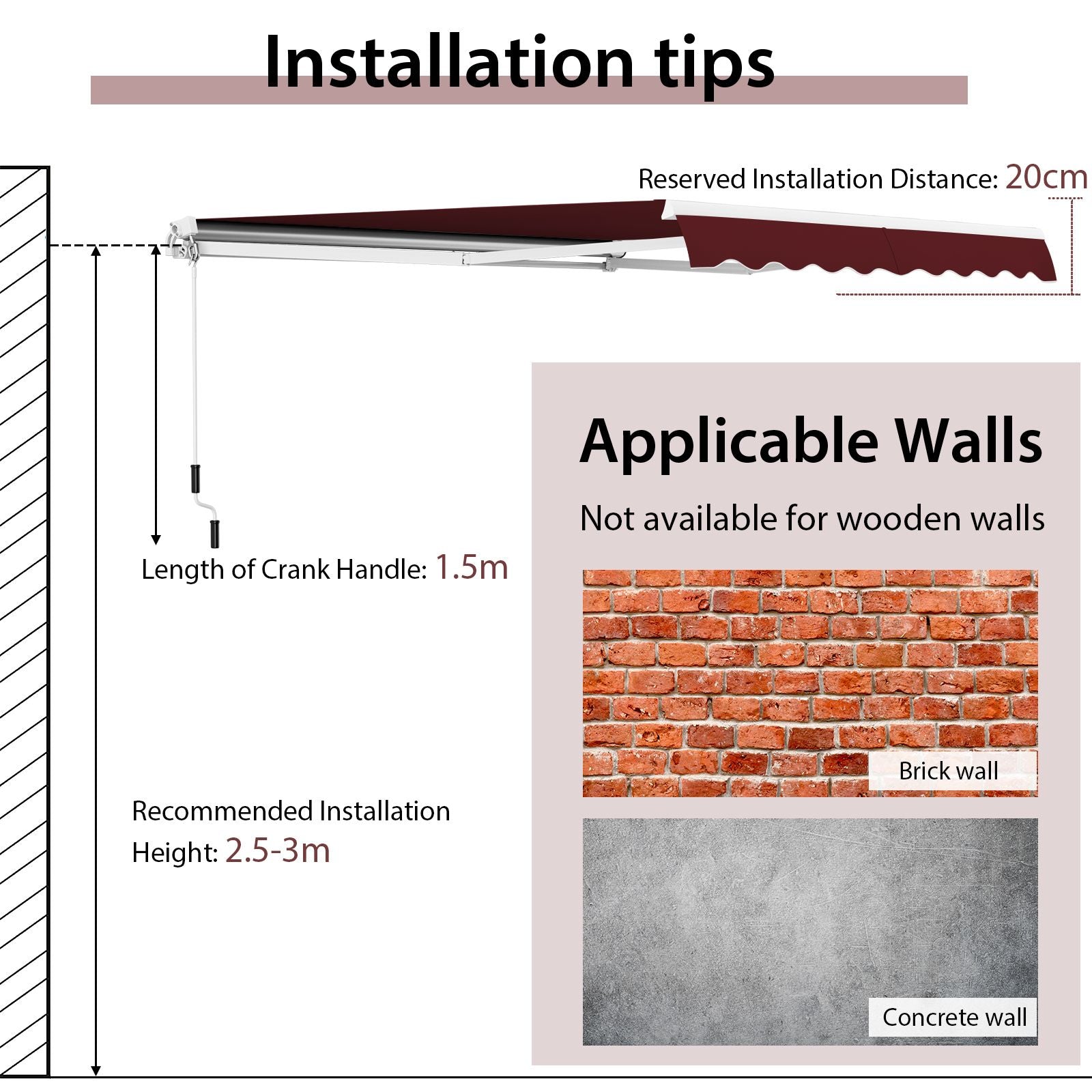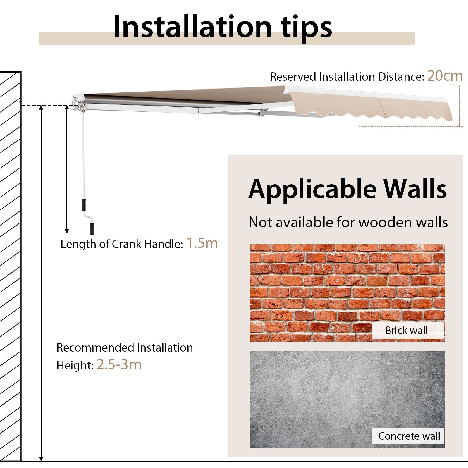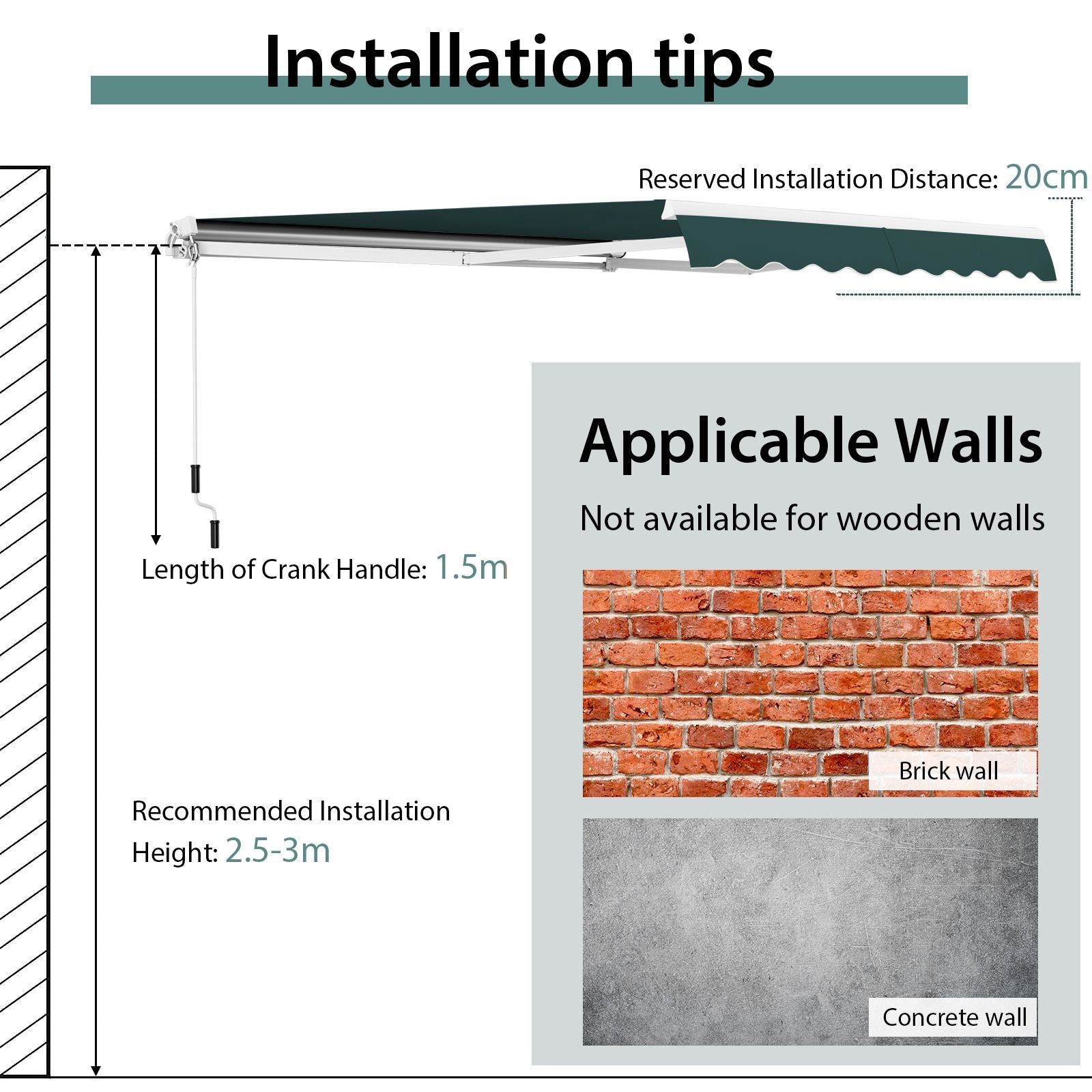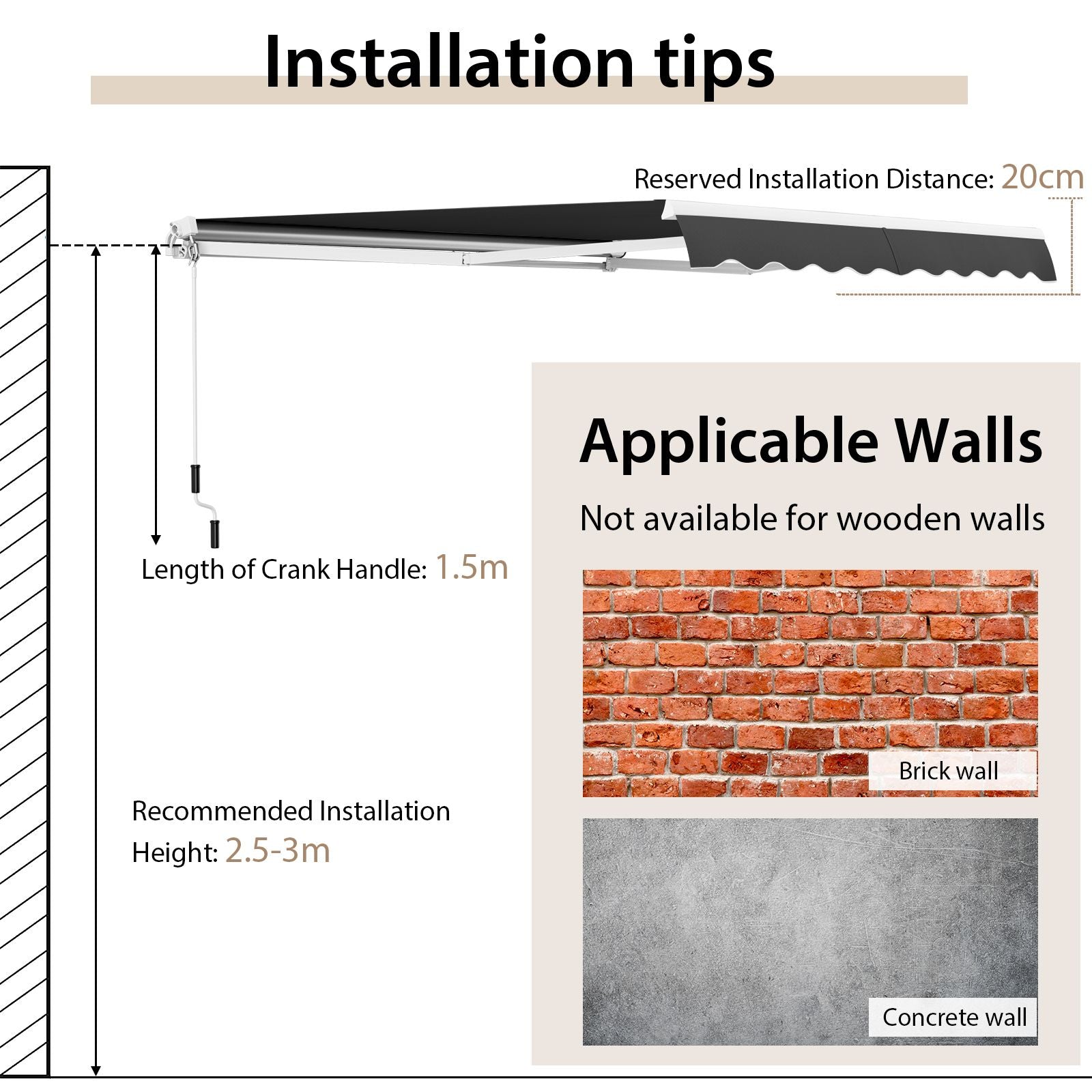 Easy Assembly: The retractable awning can be easily and correctly installed with complete accessories and detailed instructions. Note that this awning is only compatible with concrete walls or brick walls, not wooden walls.