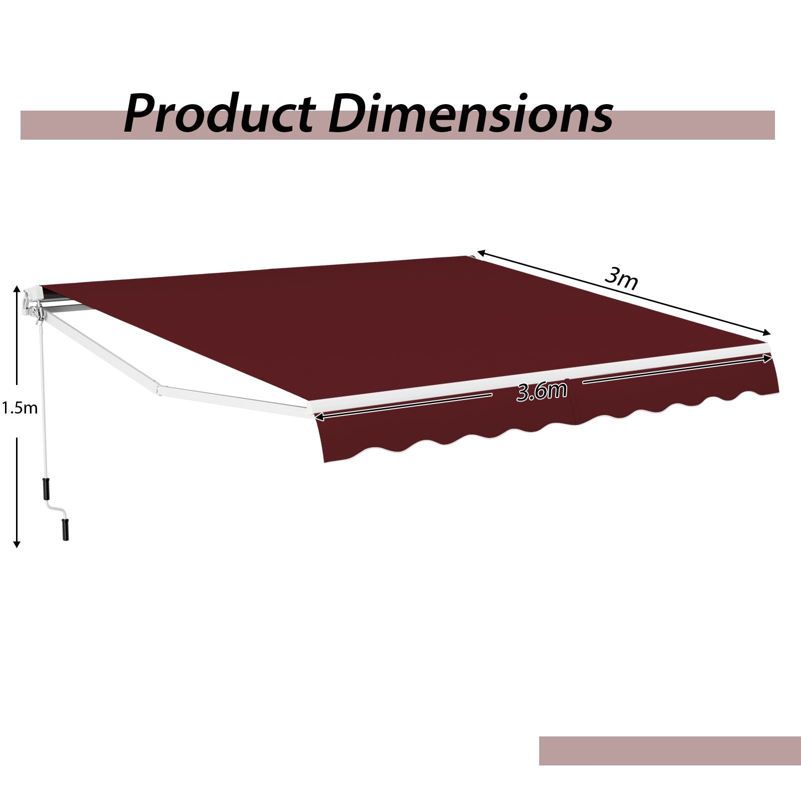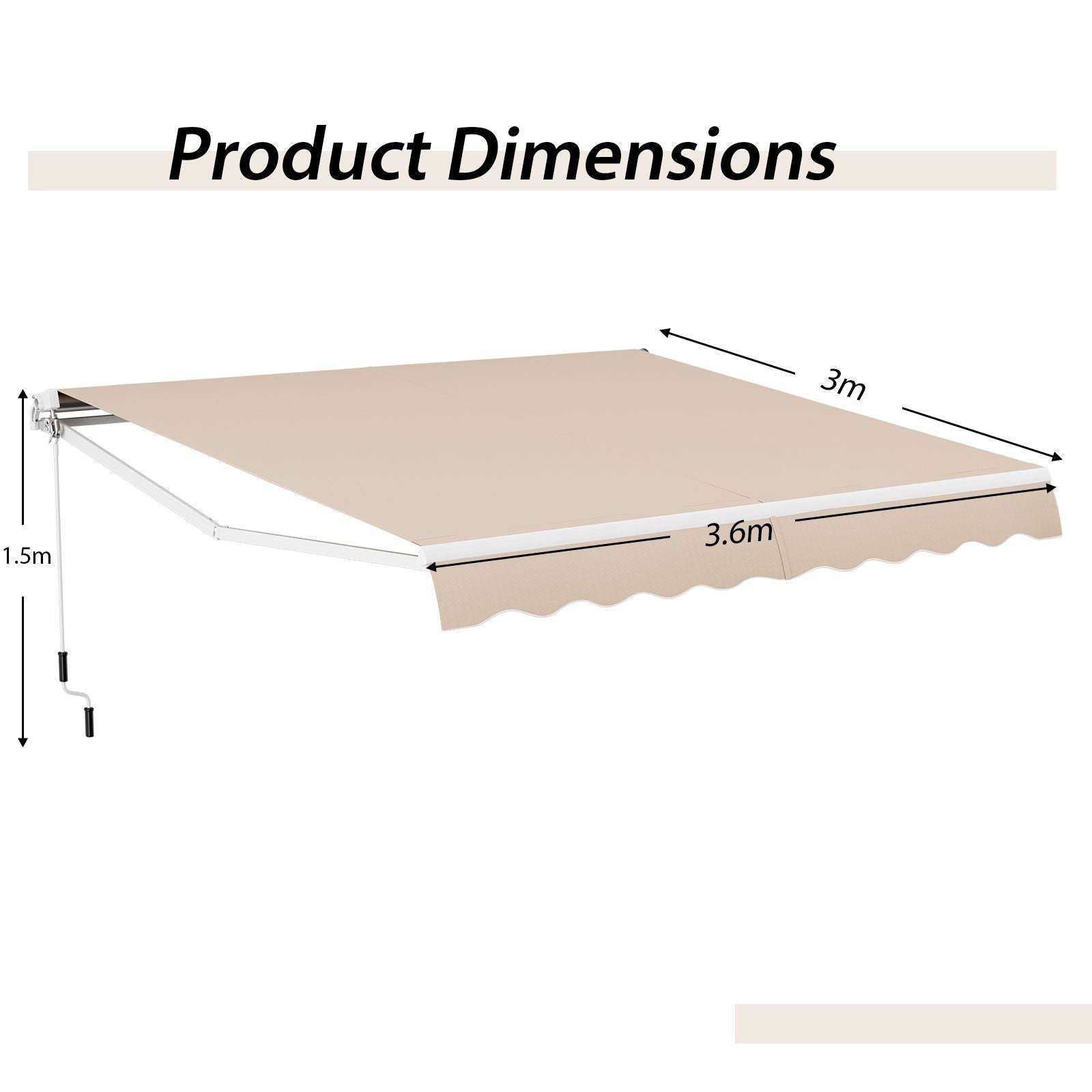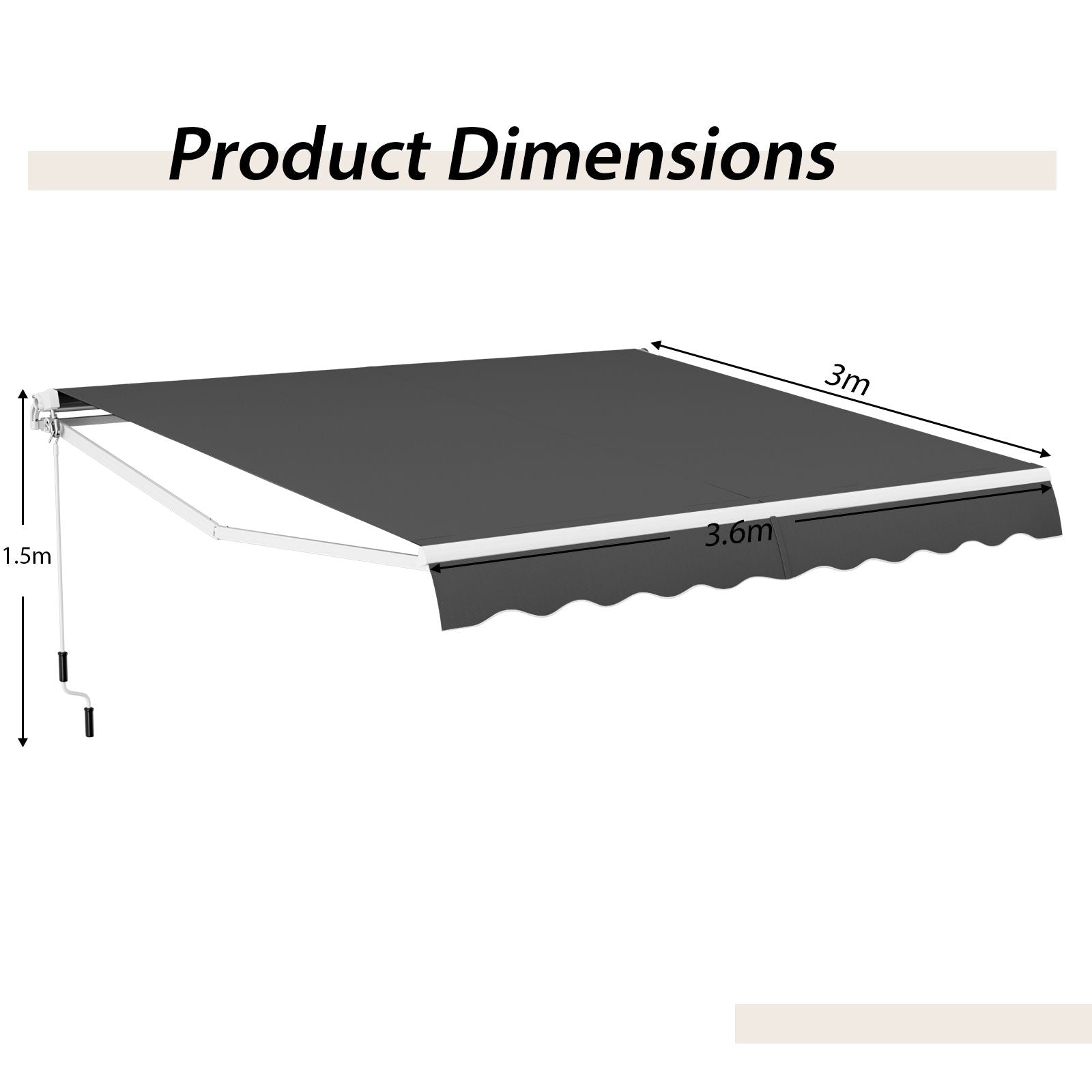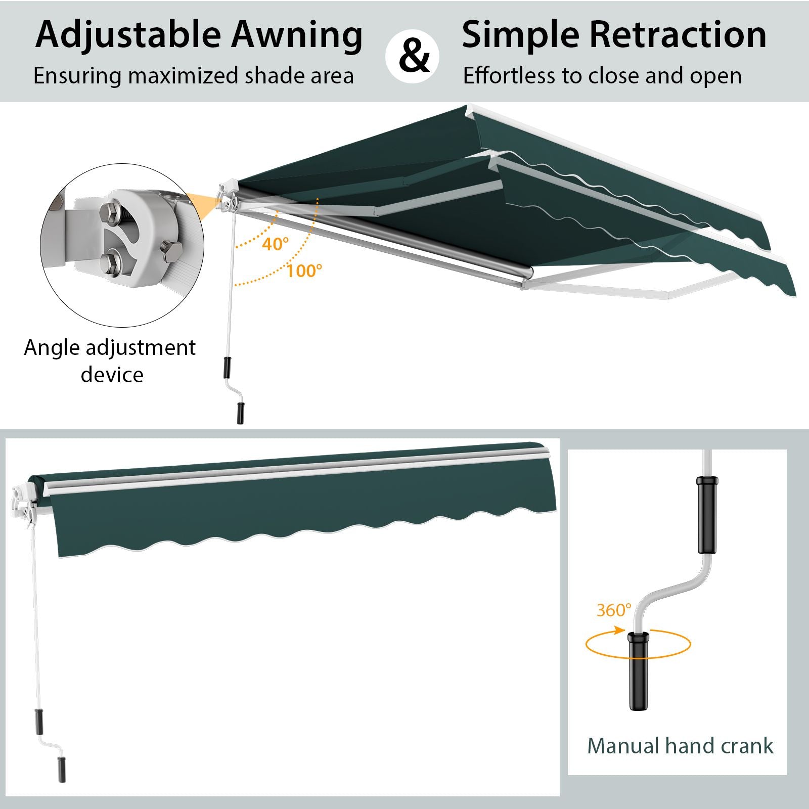 Simple Retraction: This sun shade awning features a 1.5 m manual hand crank that is easy to operate. It's effortless to close and open the awning by rotating the manual handle crank, saving your effort and ensuring safety as you won't have to climb up or down.