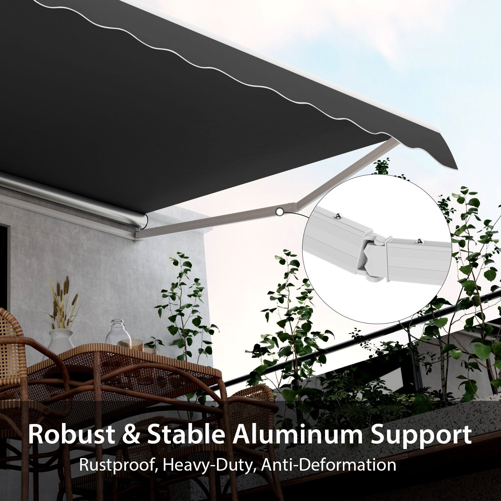 Strong and Durable Structure: The main frame of the retractable awning is made of reinforced metal and aluminum alloy. Smooth gliding front support bar and solid metal supporting bracket make the whole structure highly stable. Note that this awning is not suitable for rainy days.