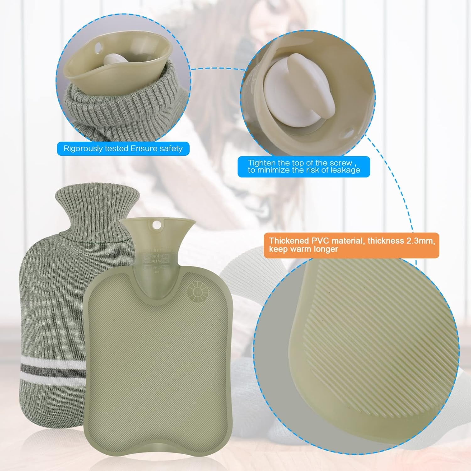 ➤Made of thickened PVC rubber to ensure maximum safety and transfer the heat perfectly, keeps the water warm for a longer time.