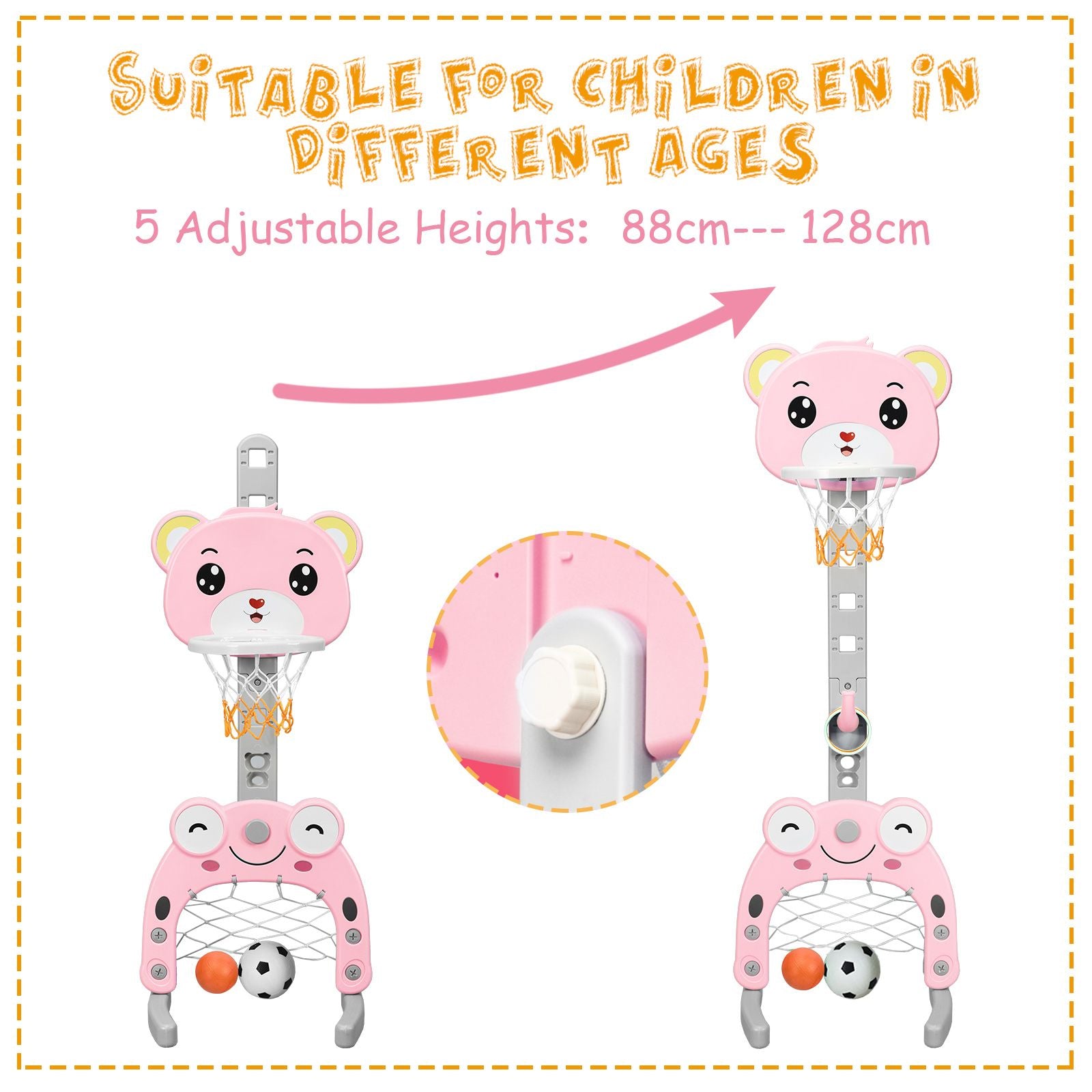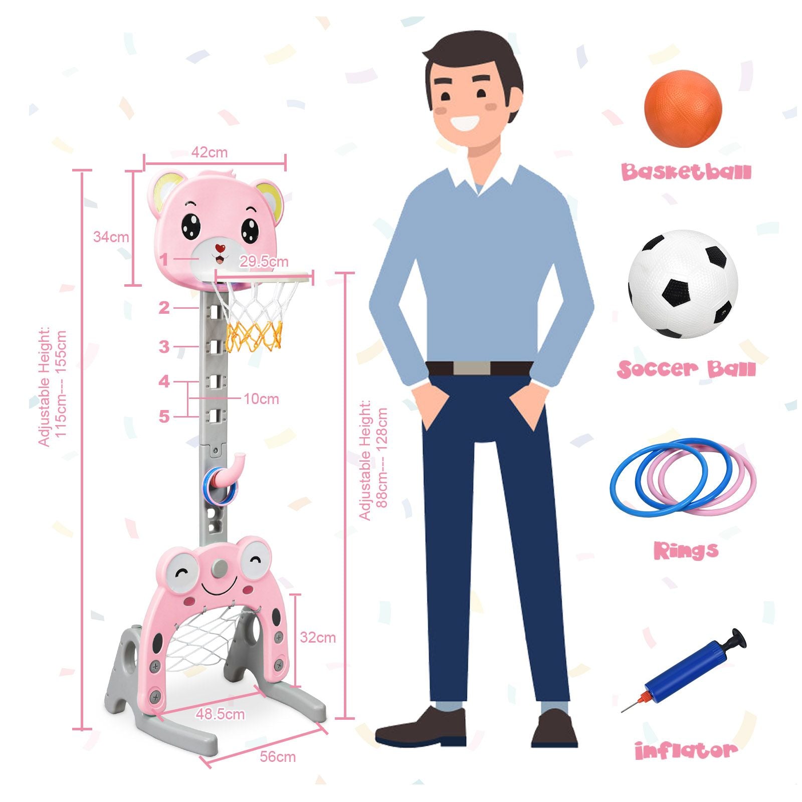 3-in-1 Activity Center: Our basketball stand includes 3 activities: playing basketball, throwing circles and playing football. Including 1 basketball, 1 football, 4 rings and 1 inflator, kids can start playing basketball right away and have fun. It also allows kids to play together to exercise their competitiveness and team spirit.