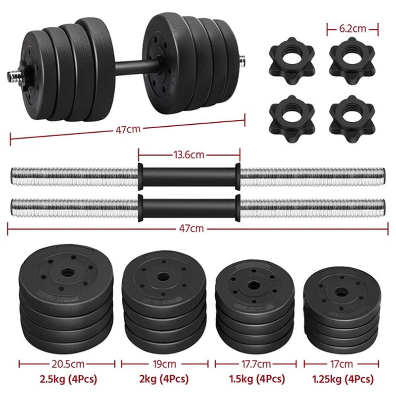 Weight Plate Quantity: 4pcs 2.5kg/5.5lb weight plates = 10kg/22lb; 4pcs 2kg/4.4lb weight plates = 8kg/17.6lb; 4pcs 1.5kg/3.3lb weight plates = 6kg/13.2lb; 4pcs 1.25kg/2.8lb weight plates = 5kg/11lb