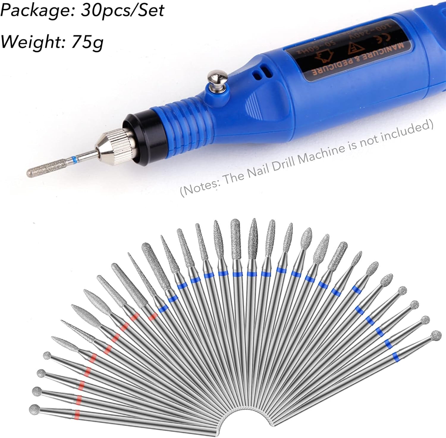 30Pcs Diamond Nail Drill Bit Set, 3/32 Inch Tungsten Carbide Drill Bits for Electric Nail Cutter, for Acrylic Gel Nails Cuticle Manicure Pedicure