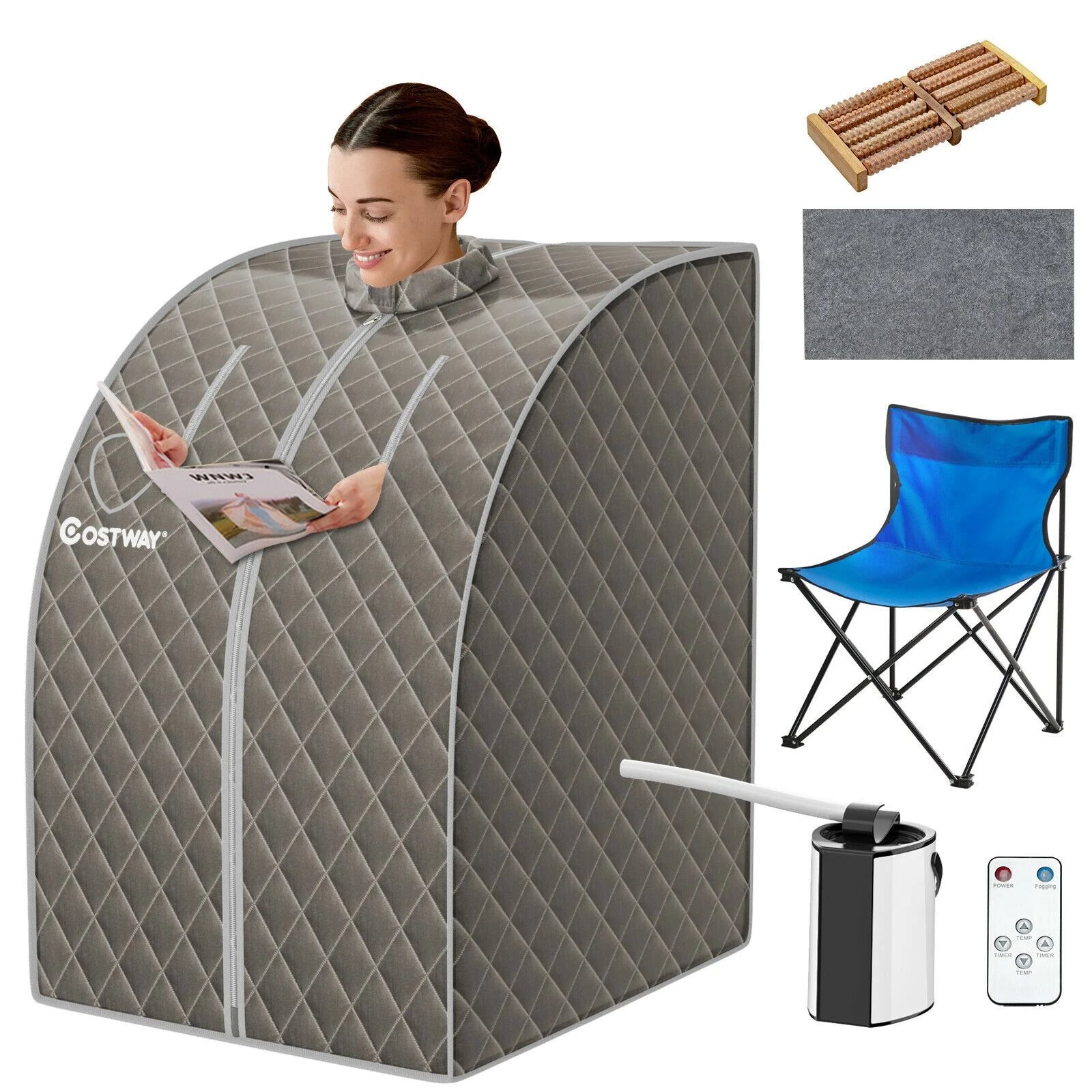 The sauna tent is made of waterproof fabric for easy maintenance and good heat retention. The two zipper openings are designed to free your hands to do other things while using the sauna. Thanks to 9-level temperature up to 64℃ and 9 timer options (15mins-90mins), you can choose any temperature and time you like by the remote control. Featuring a tempered glass lid, this 3L steamer with atomization is explosion-proof and leak-proof. Detachable frame design makes it simple to enjoy your sauna anywhere you go. The attached folding chair can be used to solve the seat problem.
