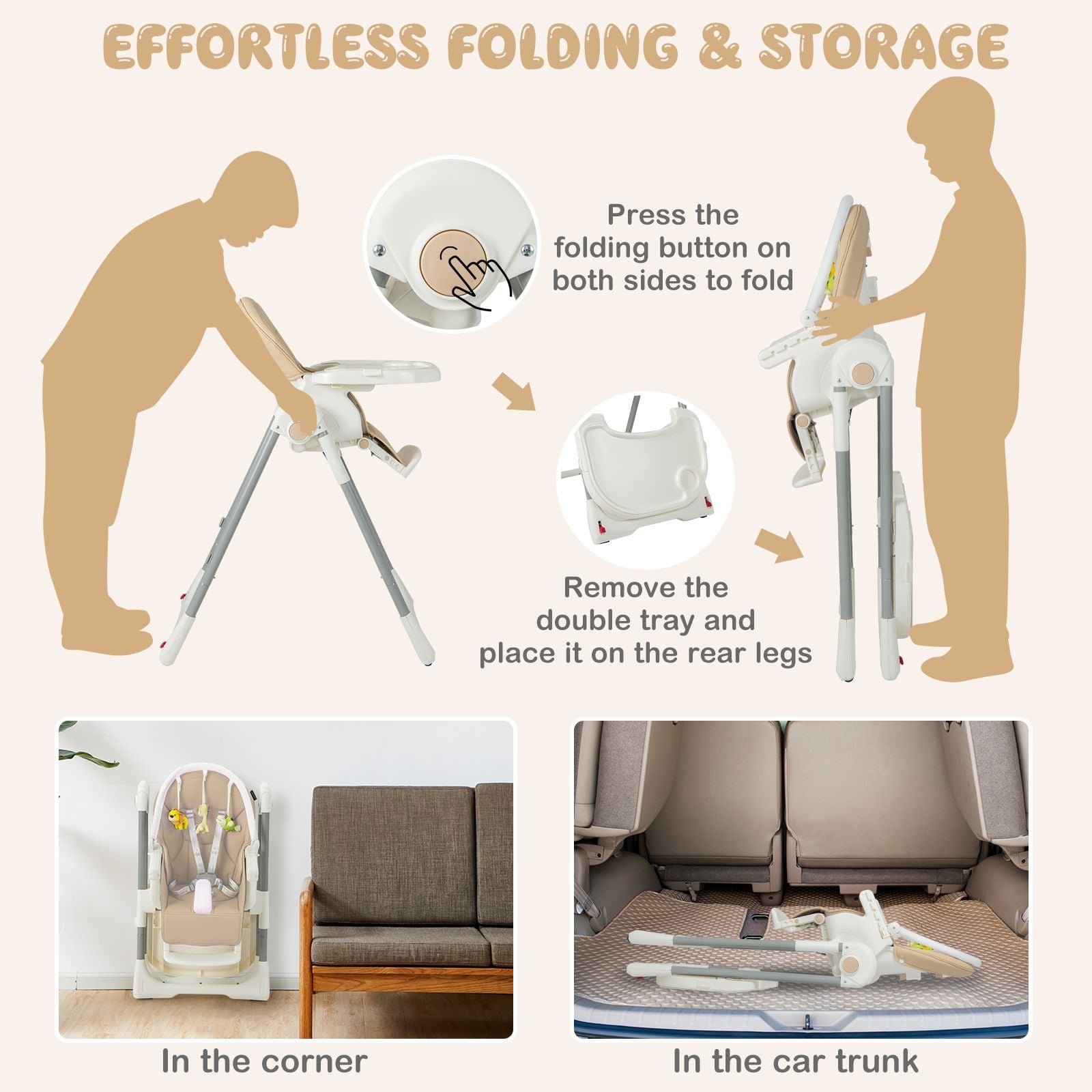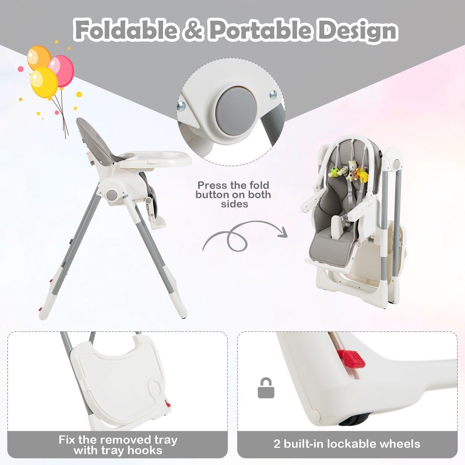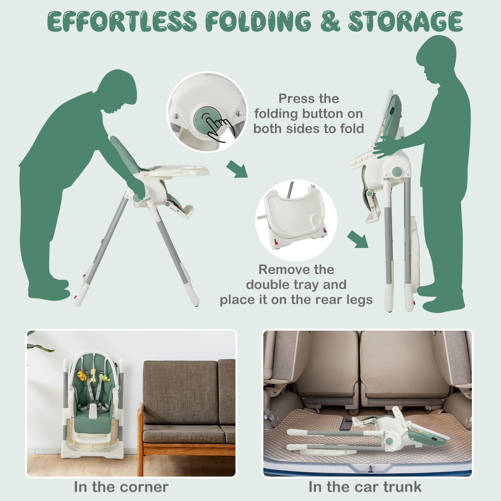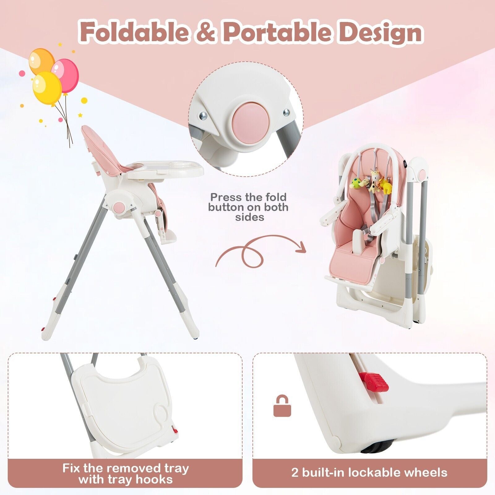 Easy Folding and Movement: The baby highchair can be folded into a compact size by pressing the fold button on both sides, allowing for convenient storage and transport. Besides, the removed tray can be fixed on the rear legs using tray hooks. 2 smooth wheels make movement effortless and are lockable to keep the chair still.
