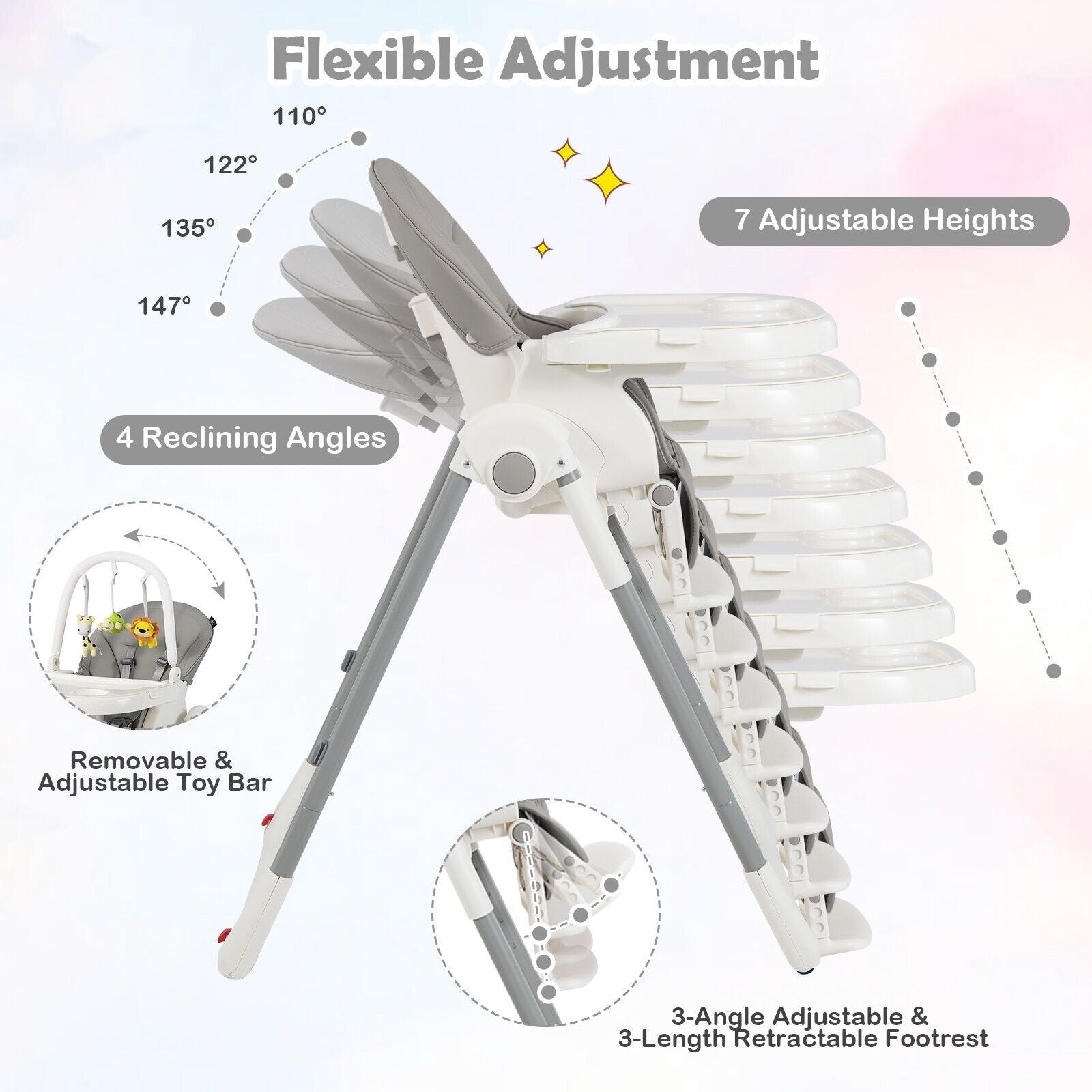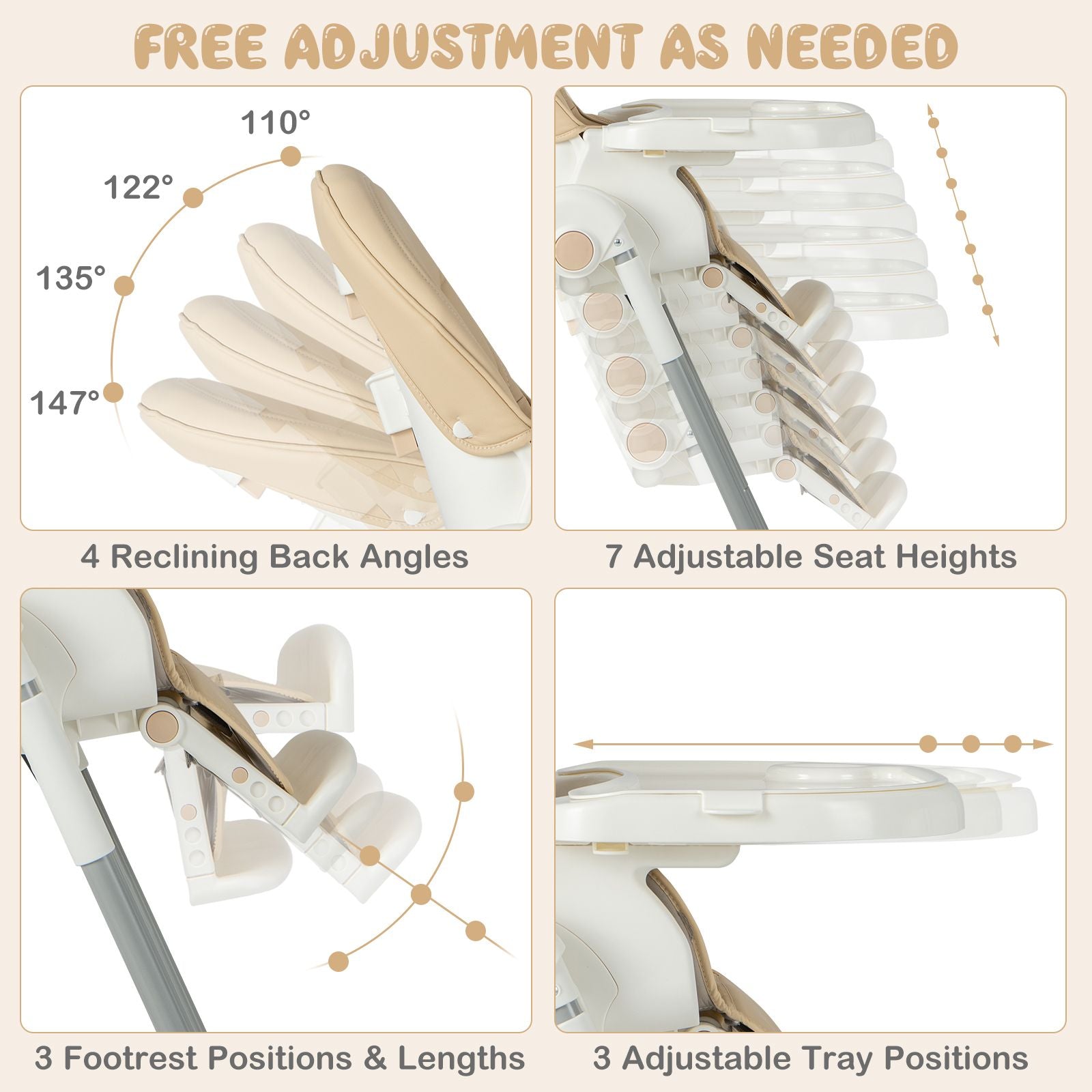 Multiple Flexible Adjustment: This foldable baby high chair is designed with lots of adjustable parts: 7 heights, 4 reclining angels, 3-position tray, 3-angle adjustable and 3-length retractable footrest. So babies will enjoy a comfy position in various usage scenarios as well as during their growth. Suitable age: 6-36 months.