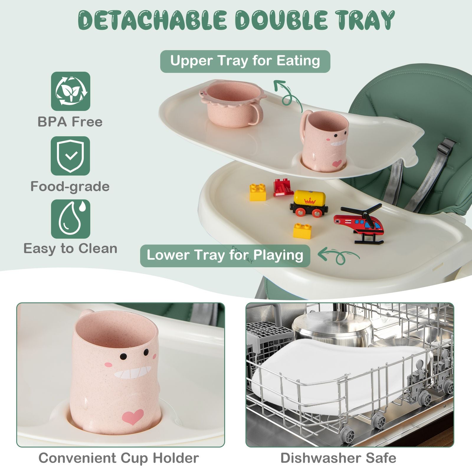 Removable Double Tray and Cushion: The upper tray with cup holder is ideal for eating while the lower tray can be used for playing, reading, etc. And both trays are removable and dishwasher safe, which effectively simplifies cleaning process. The seat cushion is featured with waterproof surface and is also removable for regular cleaning.