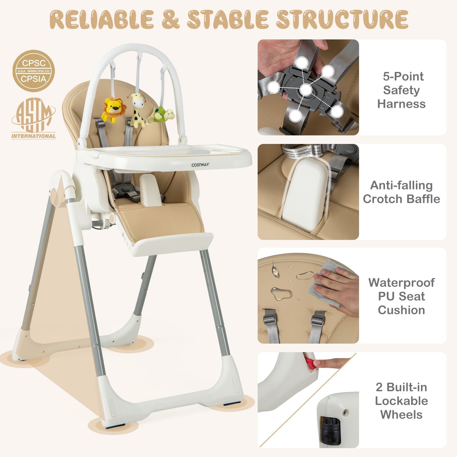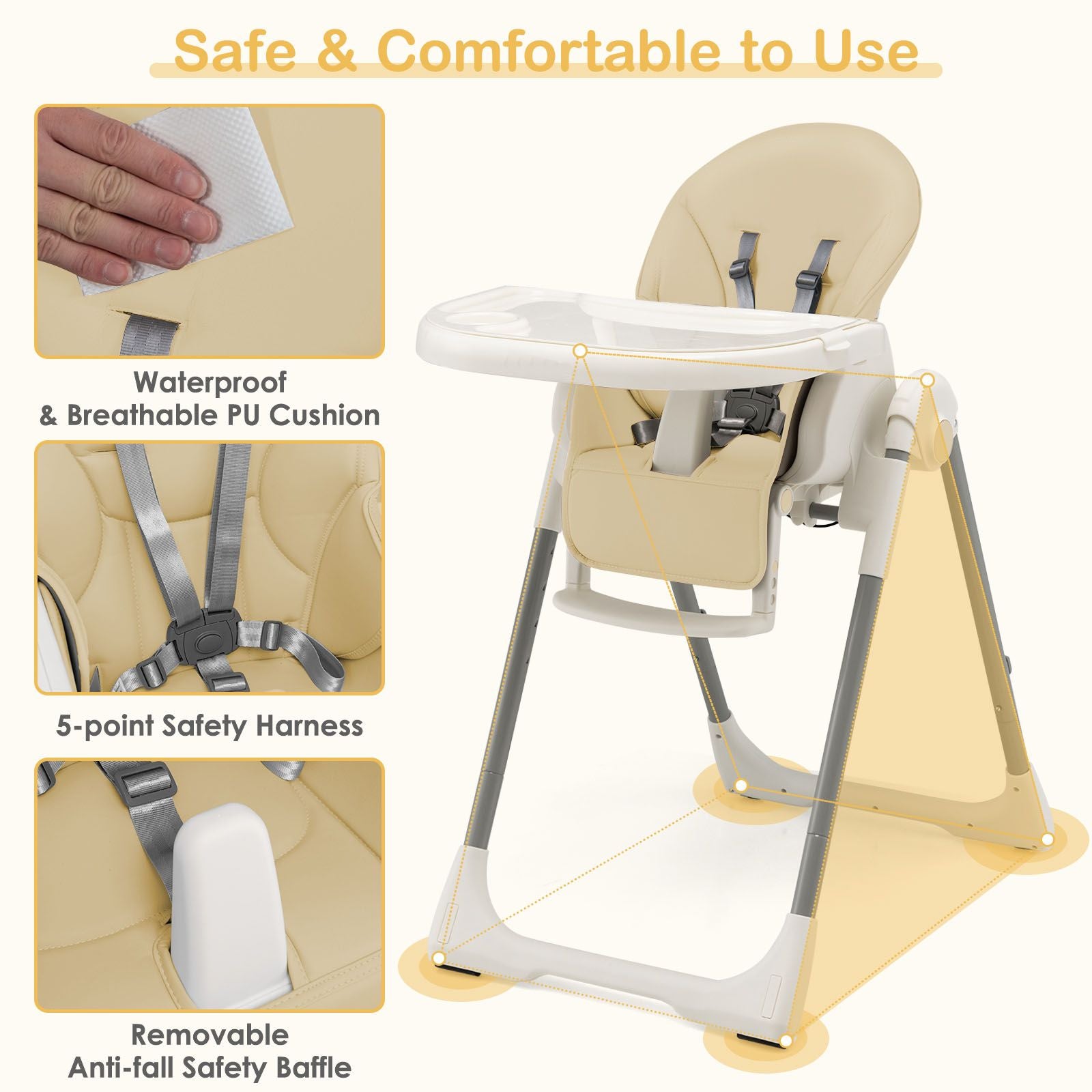 Safety Always Comes First: Certified by EN71, parents can buy with confidence. The food trays made of food grade PP material is fully BPA free, and the soft PU seat cushion is skin-friendly to baby’s sensitive skin. The triangular structure is more stable while the 5-point safety harness and anti-falling barrier add more safety.
