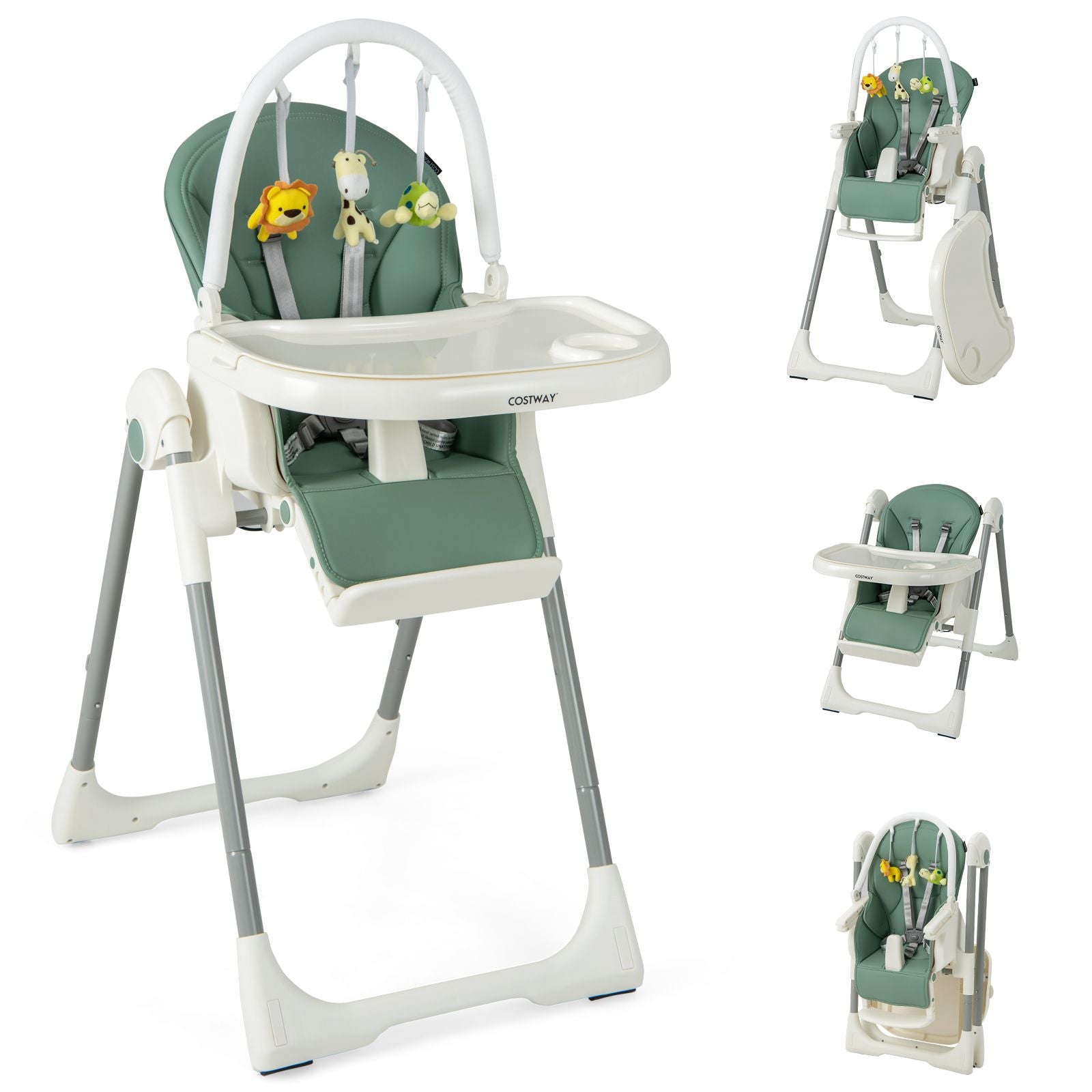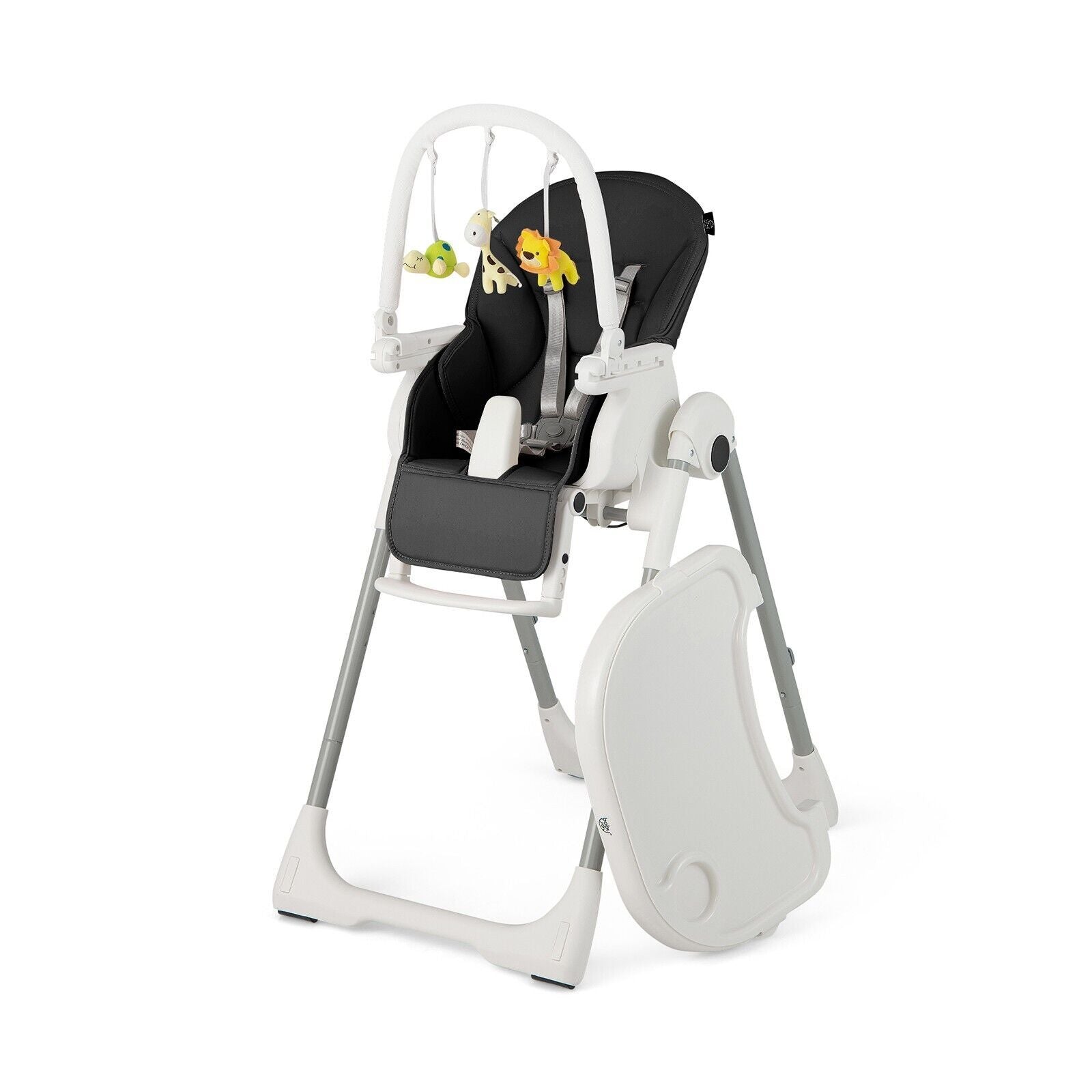 With adjustable height, backrest, footrest and tray, this convertible baby high chair provides your baby a comfortable position for eating, feeding, playing, etc. More, this baby feeding chair is featured with a removable toy bar which can promote baby’s visual development and exercise grasping ability.