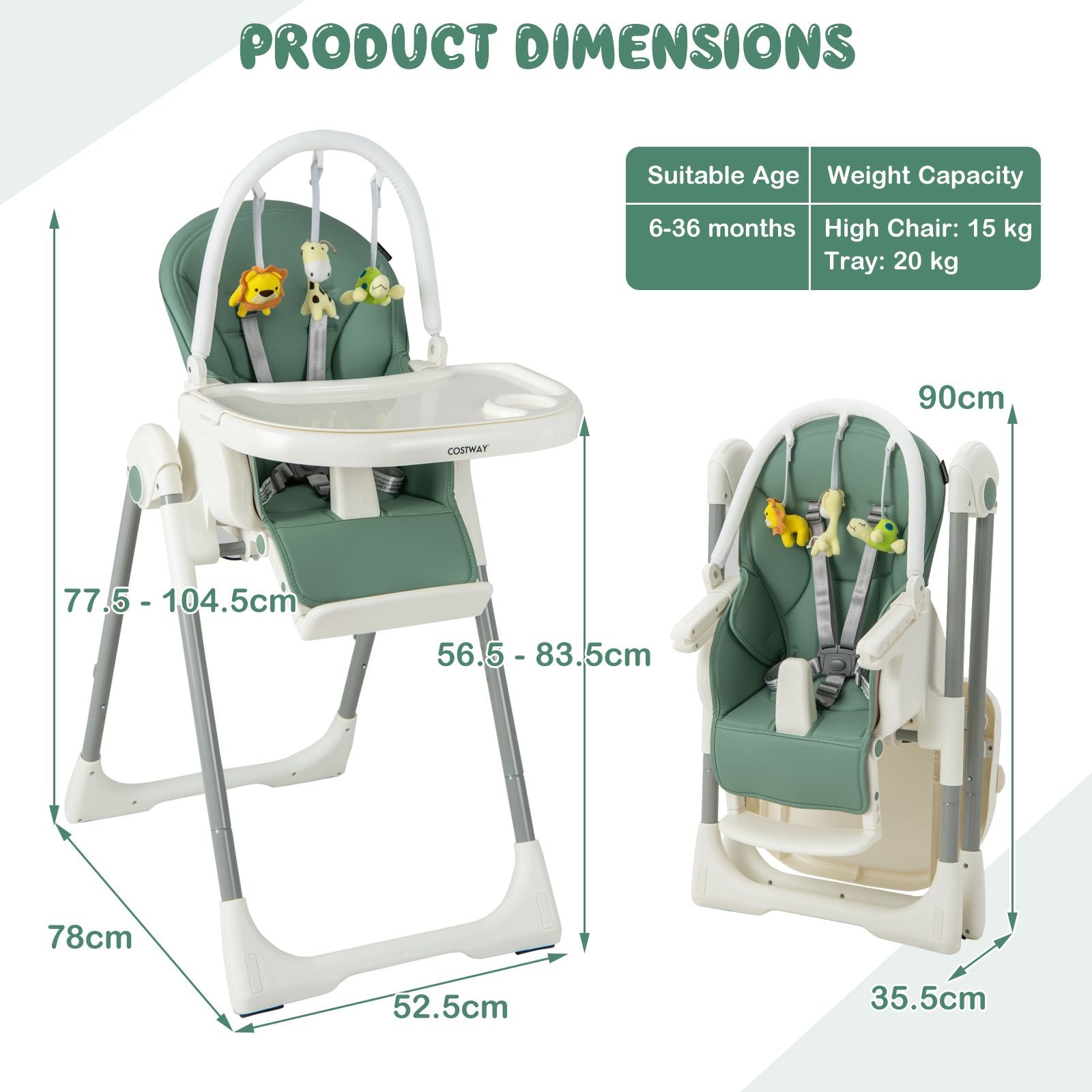 Convertible Baby High Chair: This multifunctional high chair will meet different needs of parents as their child growing from infant to toddler, suitable for independent eating, feeding, playing. In addition, the included toy bar is helpful to promote your baby's visual development and exercise grasping ability.
