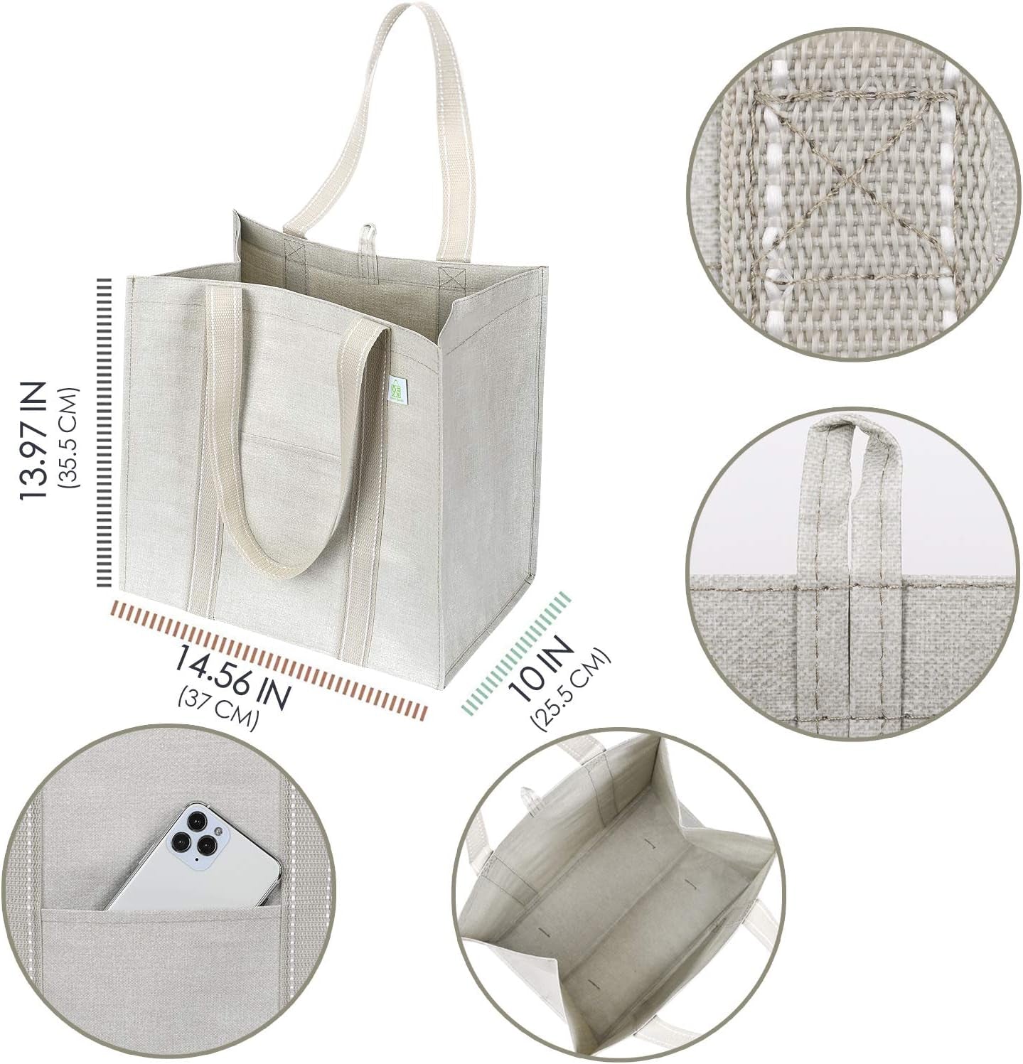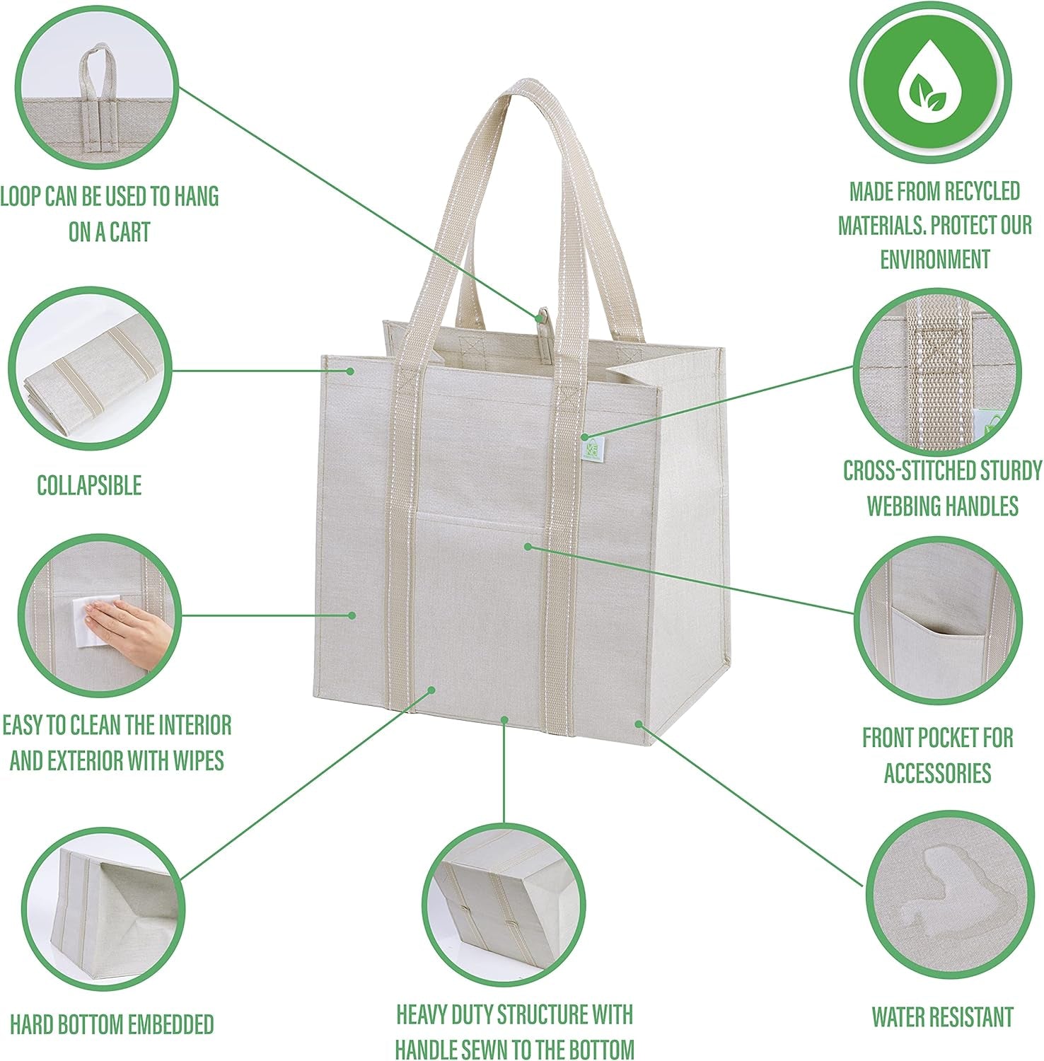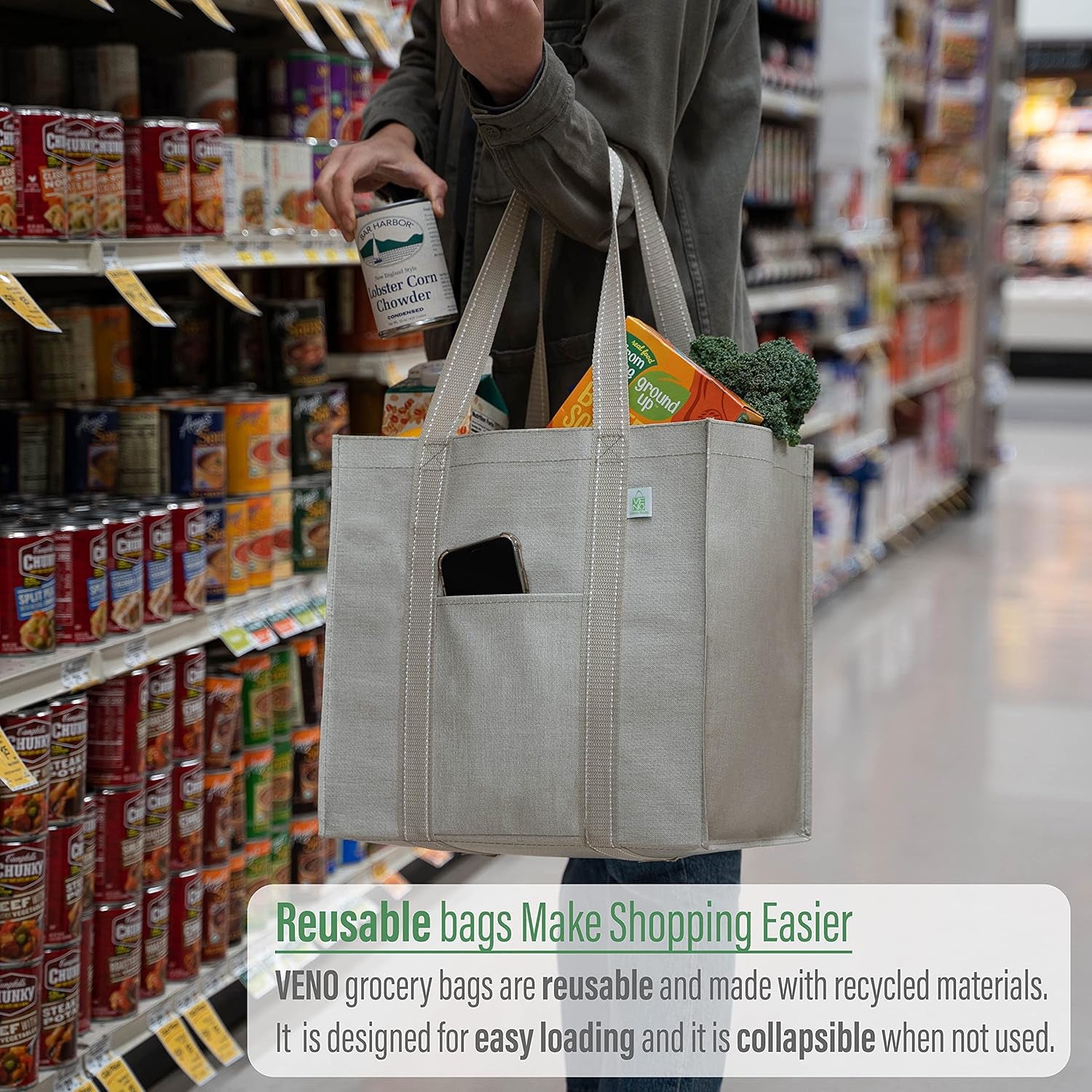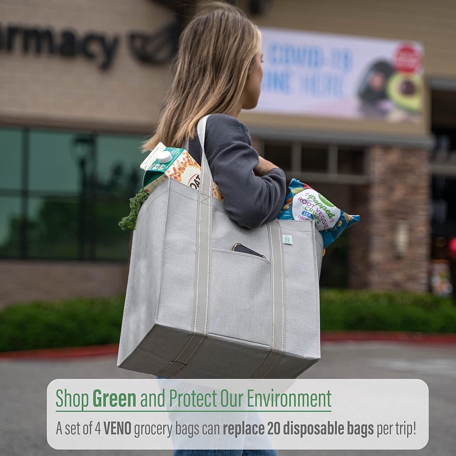 Because the environment is important to usTo make a VENO bag, we use PET, also known as Polyethylene Terephthalate. It’s one of the most common forms of plastic in the world, and it is recyclable – it is the most recycled plastic in the world. It is safe, strong, lightweight and flexible, which makes it ideal for plastic packaging, water bottles or… bags! So not only are our bags recyclable, but we use recycled bottles and other plastic products to manufacture them. Better products for greener results! What you can contribute One VENO grocery bag can replace up to 3,000 single-use plastic bags, cutting 493 pounds off your carbon footprint! Food & Family Safe is our top priority Our bags are made from premium-grade polypropylene that is BPA and BPS free, so you can enjoy them worry-free. Built to LastNot only are these shopping bags reusable, but they're also built heavy duty with 50% heavier fabric than the industry standard. AttractiveGoing green shouldn't mean looking silly! VENO bags design is classic and minimalist that looks stylish!