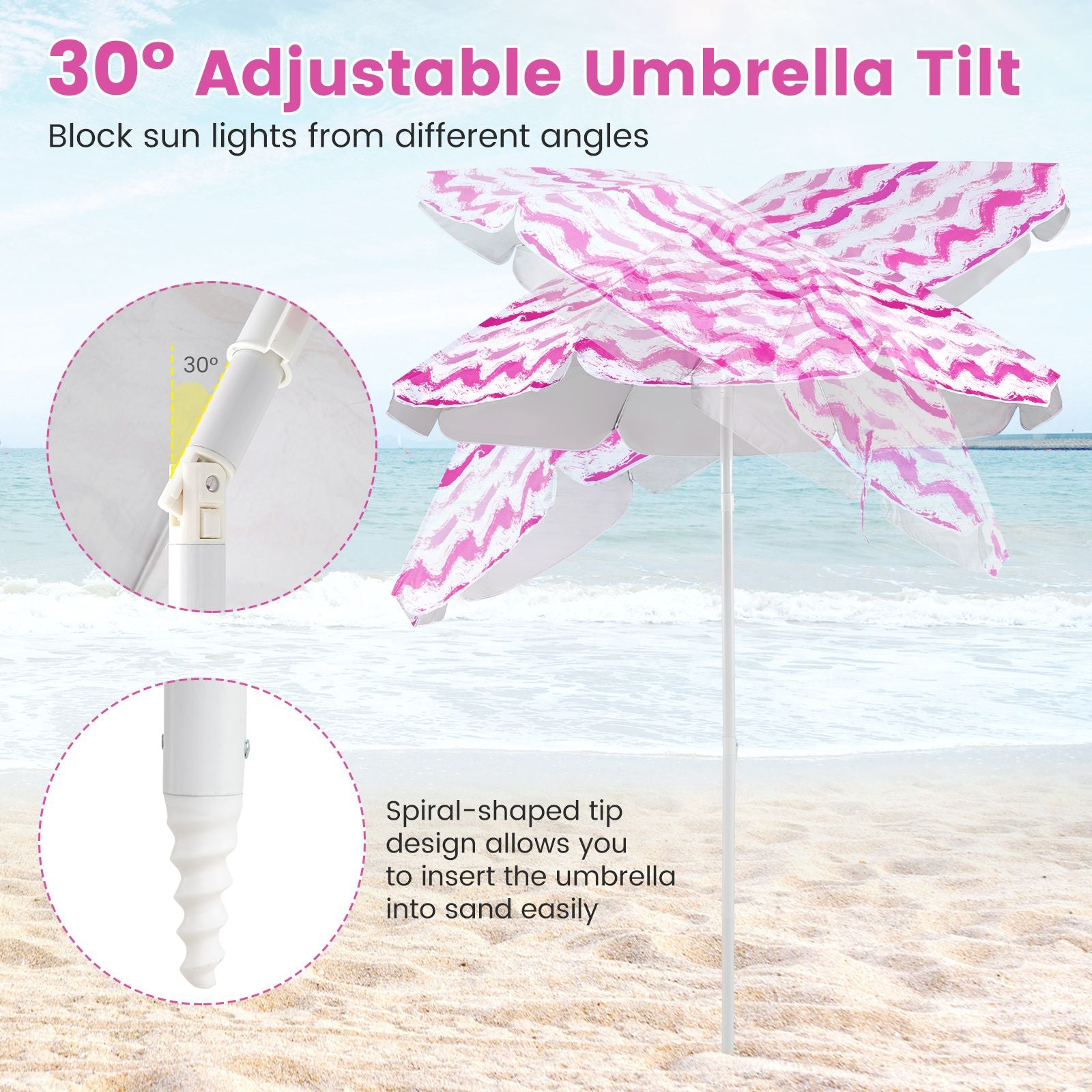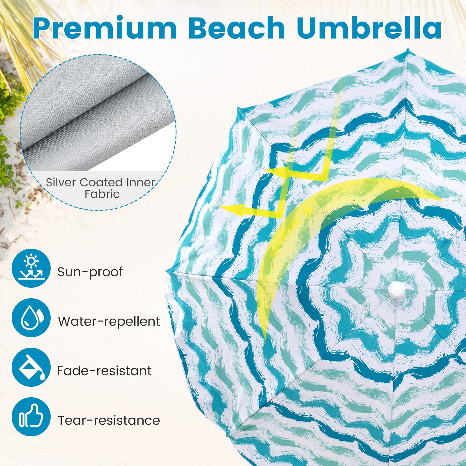 Sun-proof Umbrella with Tilt: The beach umbrella has a silver-coated premium polyester fabric canopy that provides effective protection from the sun, along with a 30° tilt capability for optimal sun blockage as the sun's position changes. With sand anchor, the parasol allows for secure placement in the sand.