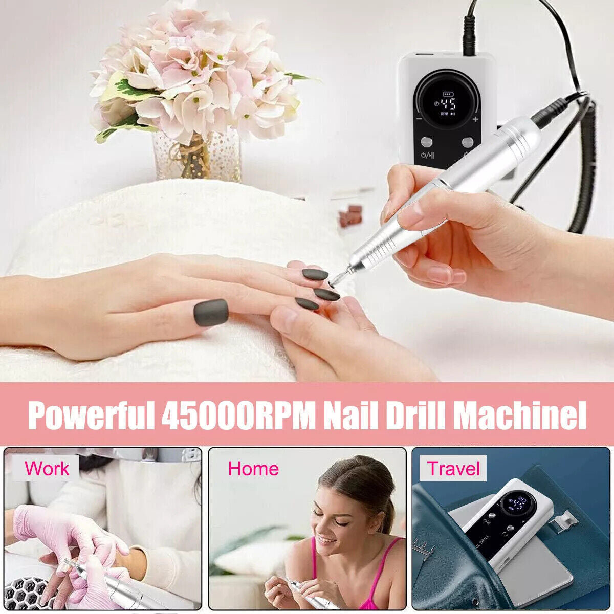 Multi-functional Nail Drill Kit: Including 6 nail drill bits and 6 sanding bands for different usage, this nail drill kit meets all nail beauty needs, perfect for manicure and pedicure, such as grinding, carving, cutting, polishing, removing natural acrylics nails, gel polish dip powder nails, callus, cuticles and more, as well as for all nail arts. If you have any problem with this nail drill, please contact us and we will try best to solve it.