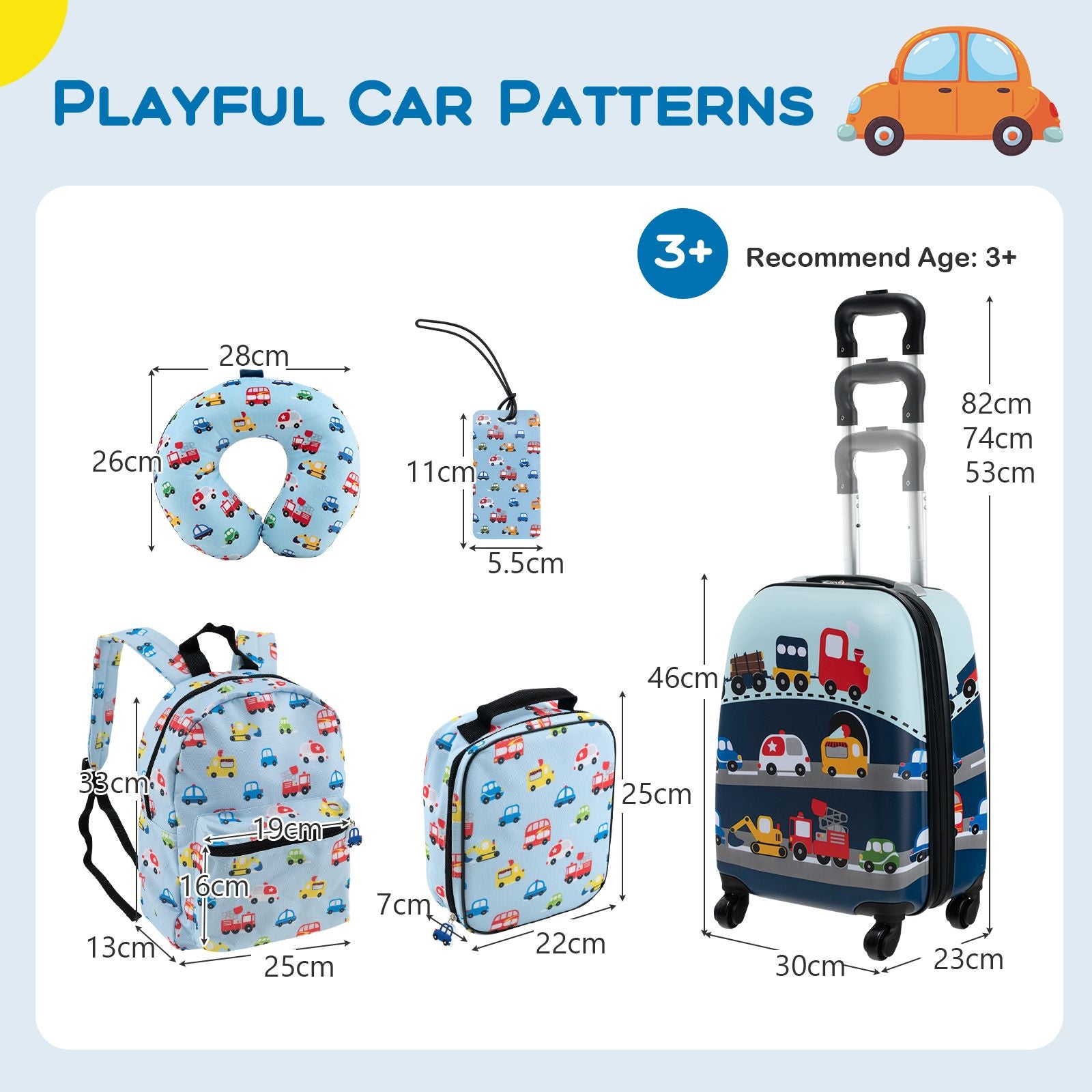 Stylish Suitcase with Safety Certifications: The kids' travel luggage set features cute pattern on the surface, making it a fashionable gift for your young traveler aged over 3 years old. With compact size, the airline-approved carry-on luggage can easily travel with you. Certified by BS EN71, the toddler luggage set is a safe choice for your little one.