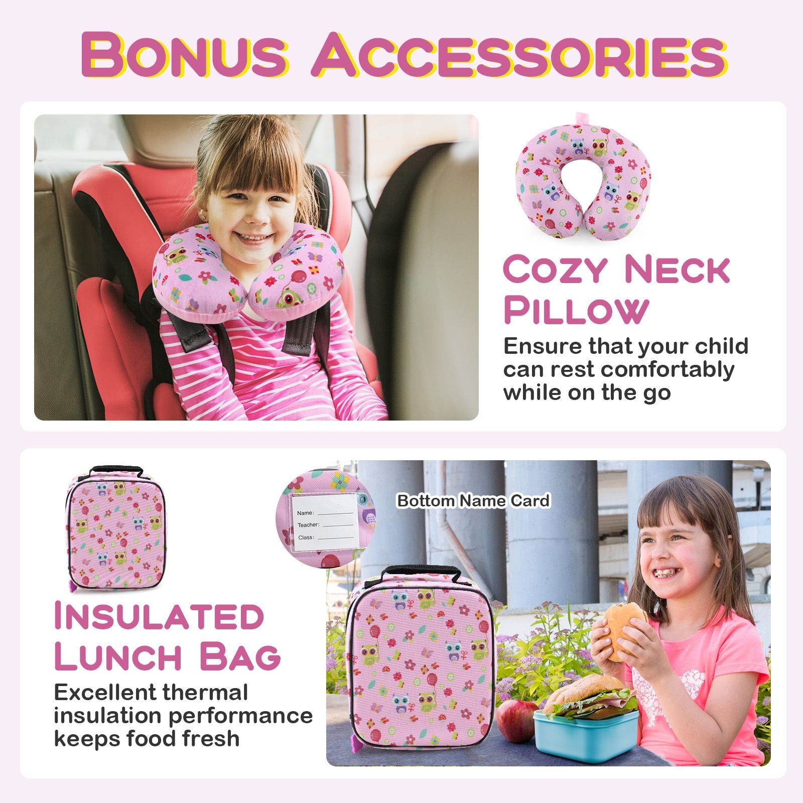 All-inclusive Kids Luggage Set: The sweet 5-piece kids luggage set features a soft velvet covered neck pillow that offers superior comfort, ensuring peaceful relaxation. Equipped with a waterproof lunch bag, your kids can enjoy fresh food at any time they desire. Besides, you can easily label the suitcase with included name tag for quick identification.