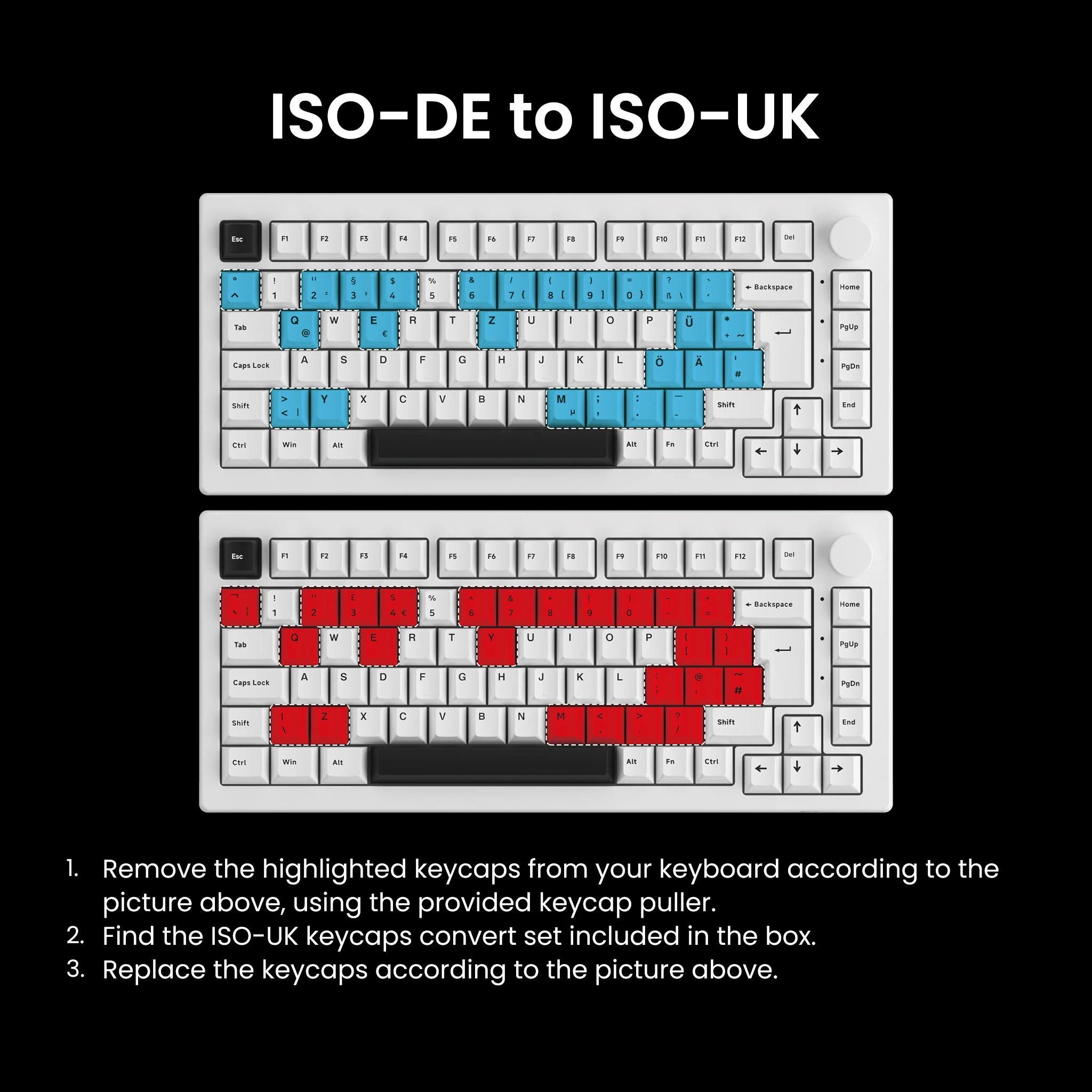 Comes with ISO-DE pre-built keyboard, ISO-Nordic and ISO-UK extra keycaps.