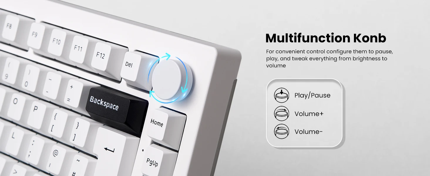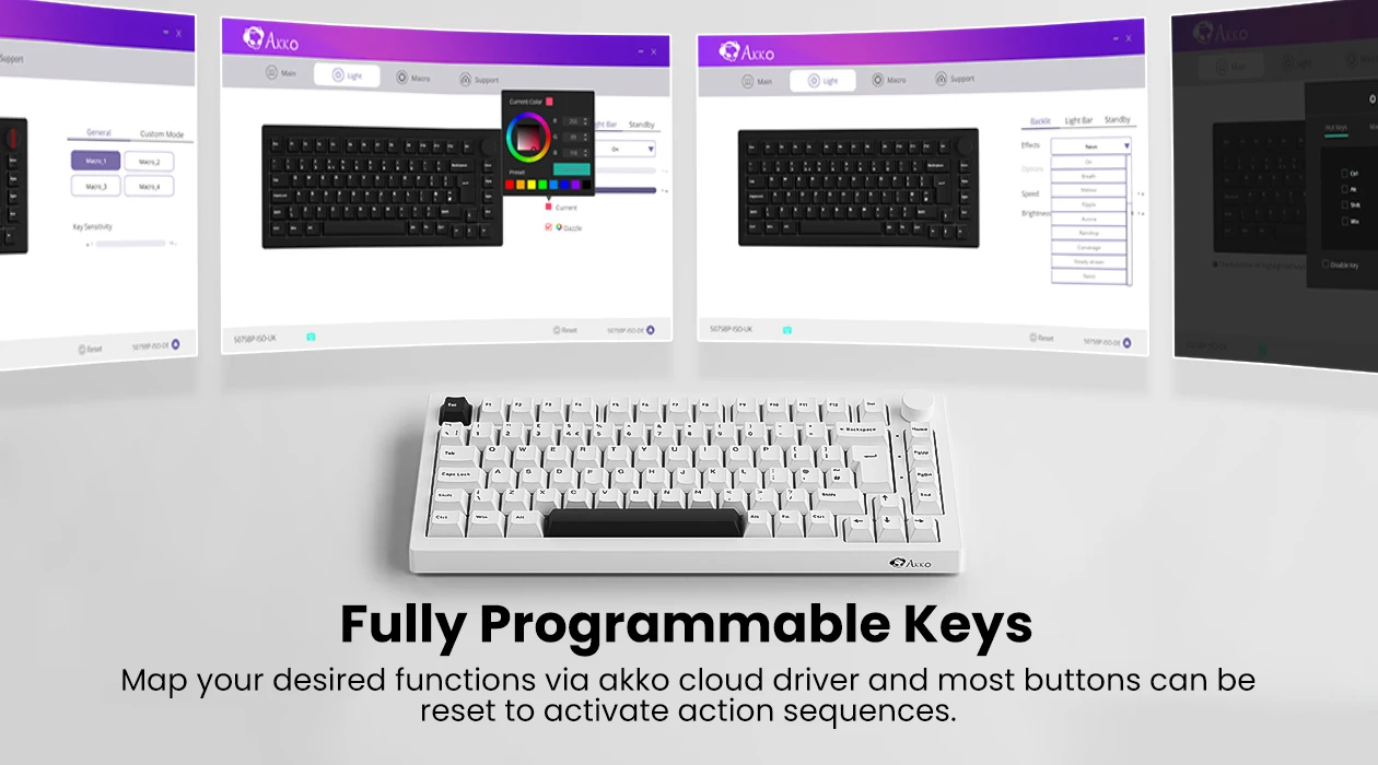 Akko 5075B Plus keyboard can be used in both wired and 2.4G modes with driver support for the Audio Visualizer feature.You can customize the side RGB and LED backlight , and remap the keys through the Akko Cloud.
