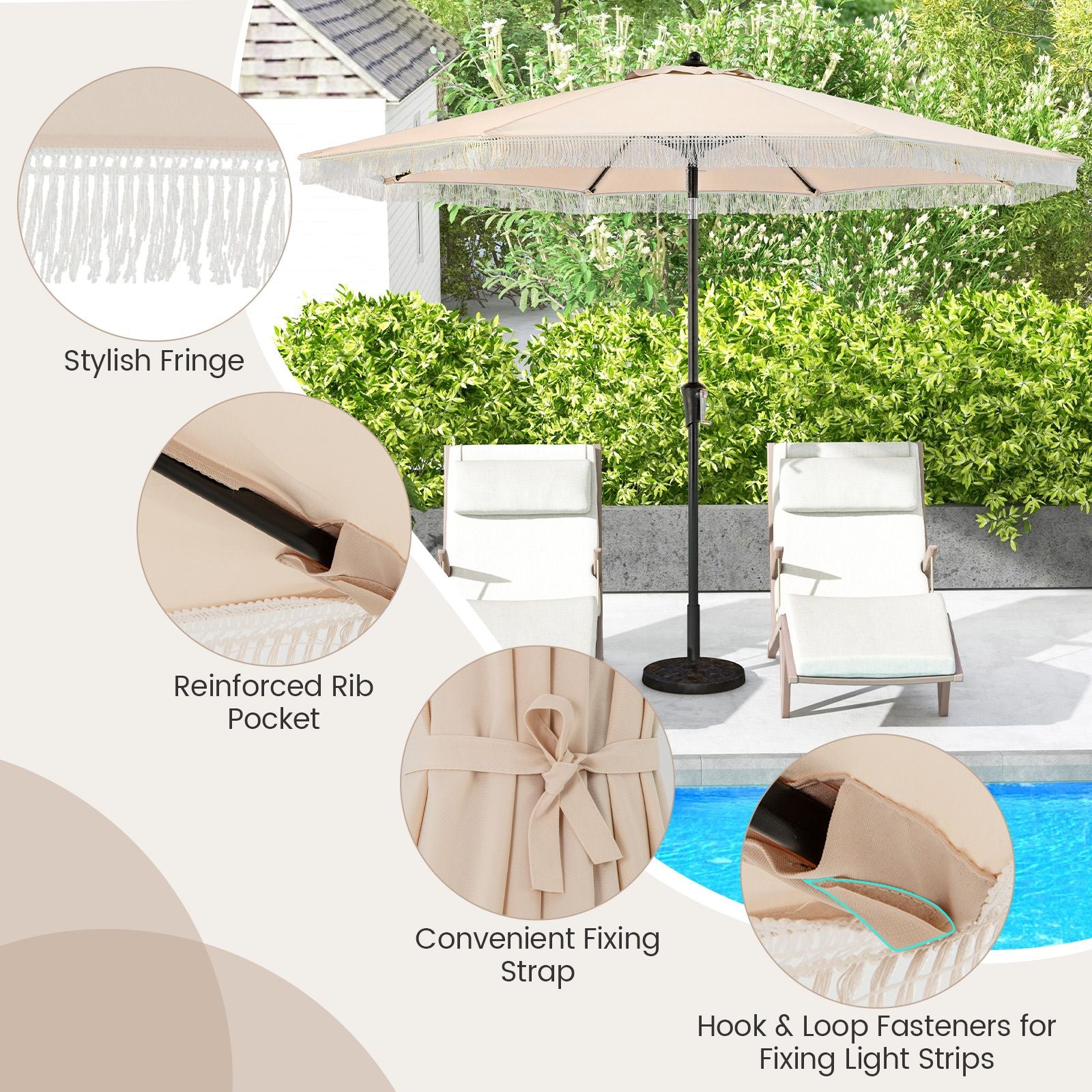 Spacious & Stylish Design: The 9 ft patio umbrella offers wide shade area for your outdoor furniture, which is ideal for various activities. The tassels of the outdoor umbrella will dance in the breeze, creating a carefree ambiance. Additionally, you can fix decorative elements with the included hook & loop fasteners.