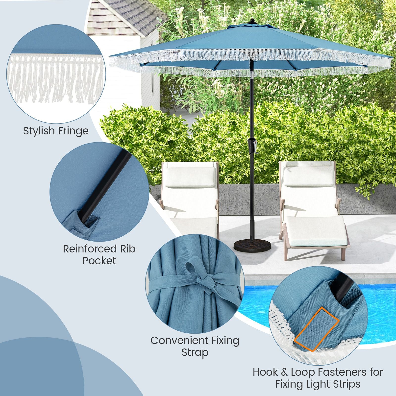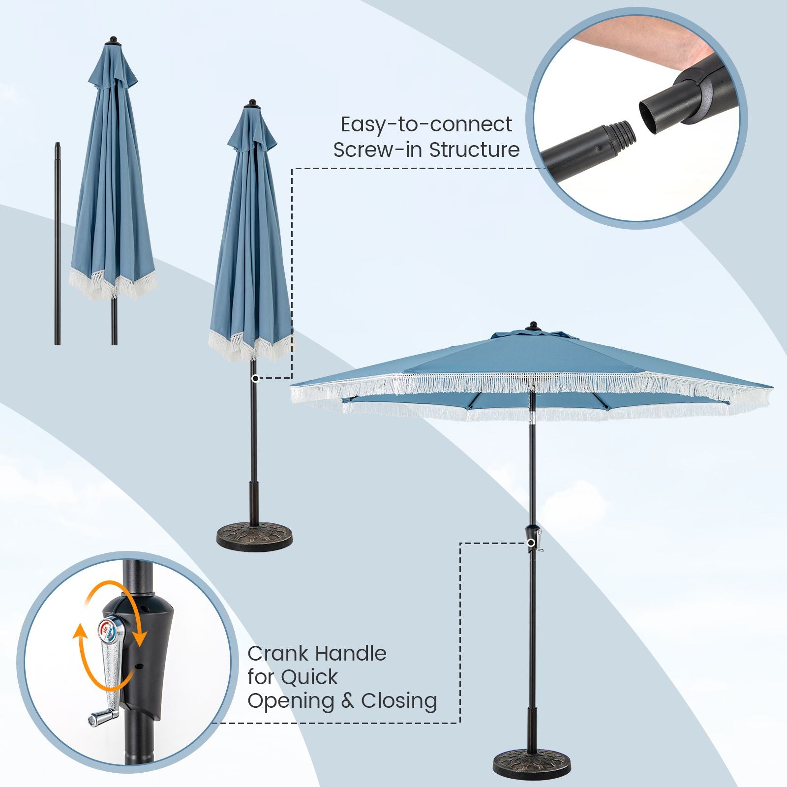The heavy duty patio umbrella offers wide shade area, providing ample coverage for your outdoor furniture and activities. Crafted with a wear-resistant polyester canopy, the market umbrella shields you from harsh sunlight for prolonged life. Moreover, the tilt system allows you to enjoy the perfect shade throughout the day. With 8 heavy duty ribs and thick umbrella pole, the outdoor tassel umbrella boasts stable structure. Also, the vented top will facilitate ventilation and increase the stability. Featuring crank handle, you can effortless open and close the umbrella. Coming with a safe latch, there is no need to worry about the umbrella accidentally closed. The market umbrella with hook & loop fasteners allow you to adorn anything you like for customizable ambience. Also, the stylish fringe will add a touch of coastal charm to your outdoor space. If you are looking for such a product, do not hesitate to buy it!