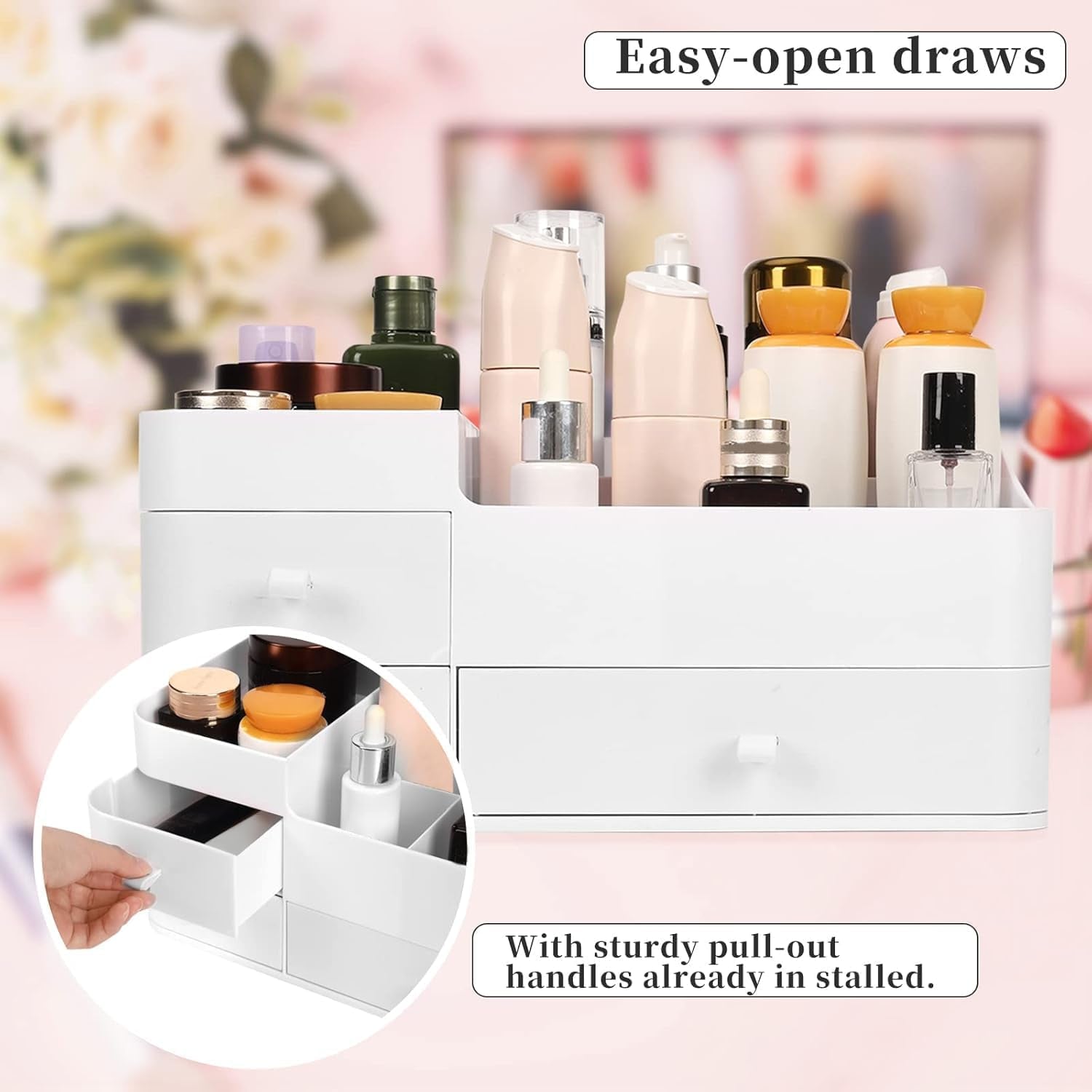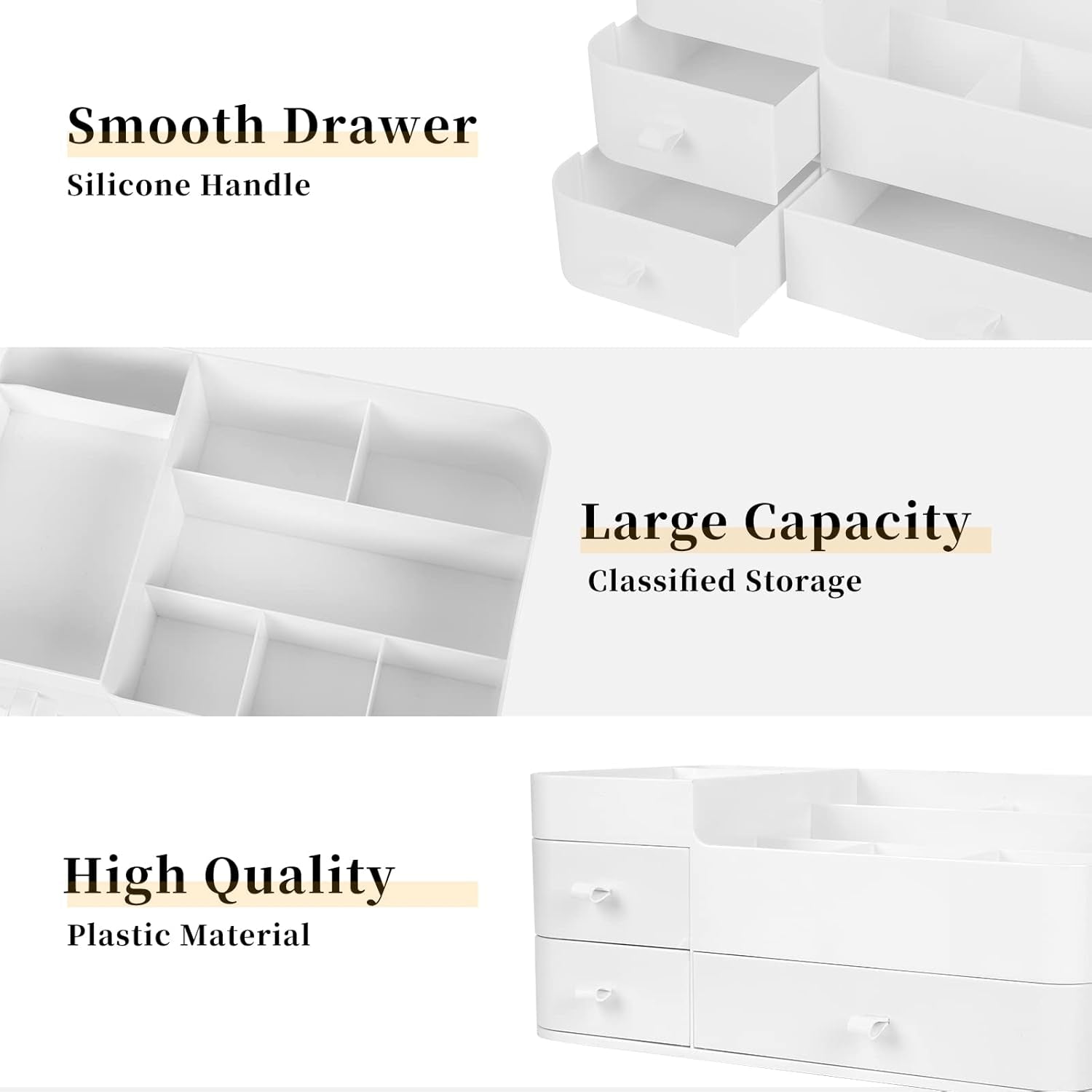 - 2. DEEP DRAWERS: Makeup Organiser is built with deep drawers,equipped with a handle, slid out easily, dust-proof and moisture-proof, easy to take, and to keep your items tidy.