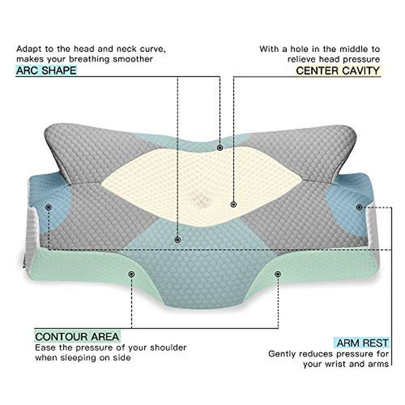 ERGONOMIC DESIGN: contour pillows are well designed to support by following the natural curve of your body keeps air passages optimal for less snoring and more restful sleep. The cutouts on the side give your top arm a place to rest and keep it at an angle so your shoulder is not hunching over in front of you.