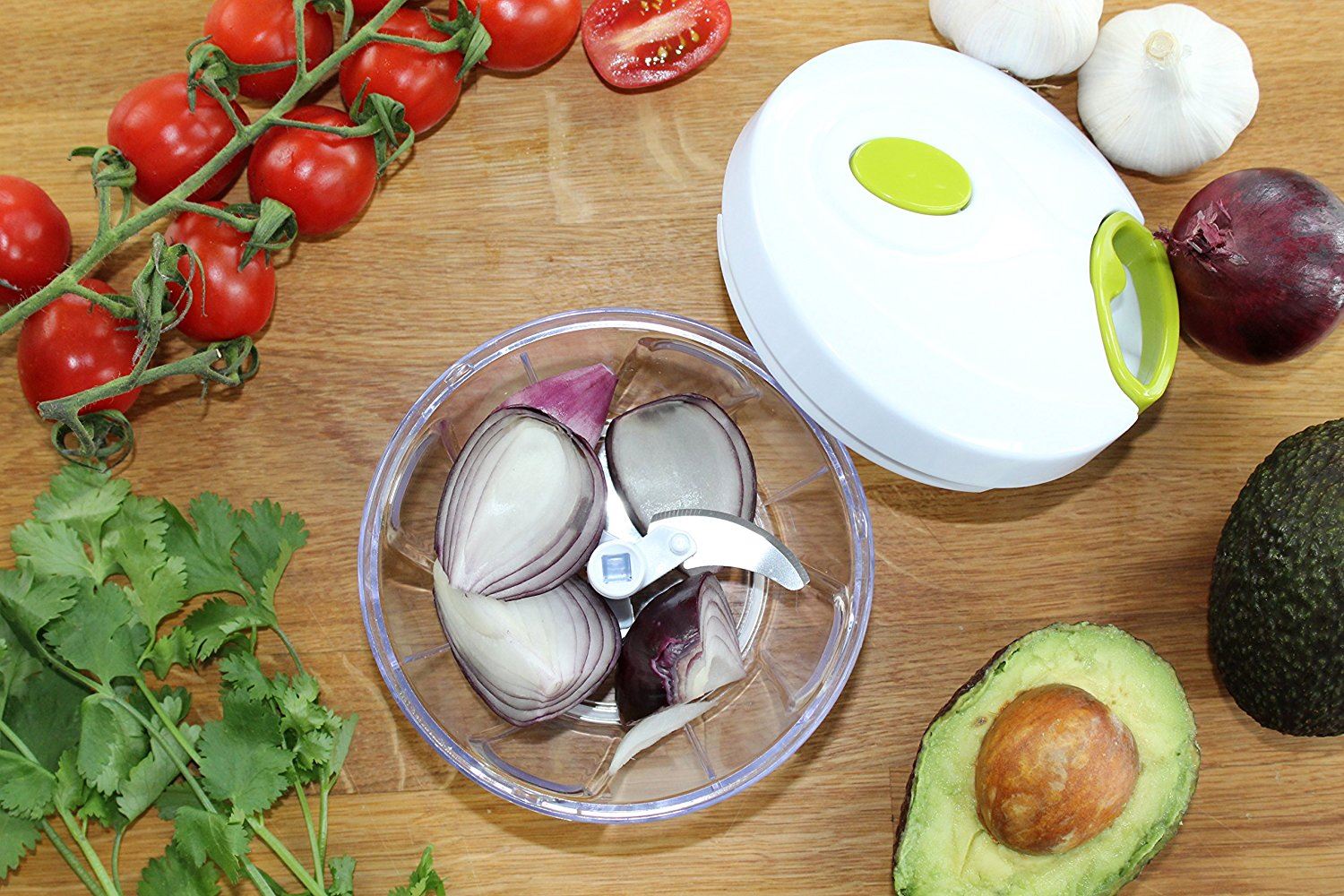 • EFFORTLESS OPERATION AND NO MORE ONION TEARS! This small hand-held device is the most powerful kitchen slicer and dicer you'll ever use. Pull on the cord and the high-tension spring mechanism causes the 3 curved, stainless steel blades to rotate at speed to blitz fruit, salad, herbs, meats, nuts, ice and even a vegetable like an onion, carrot or potato, in mere seconds. Expertly blends ingredients for homemade tomato pasta sauces, stir fries, salsa and guacamole.