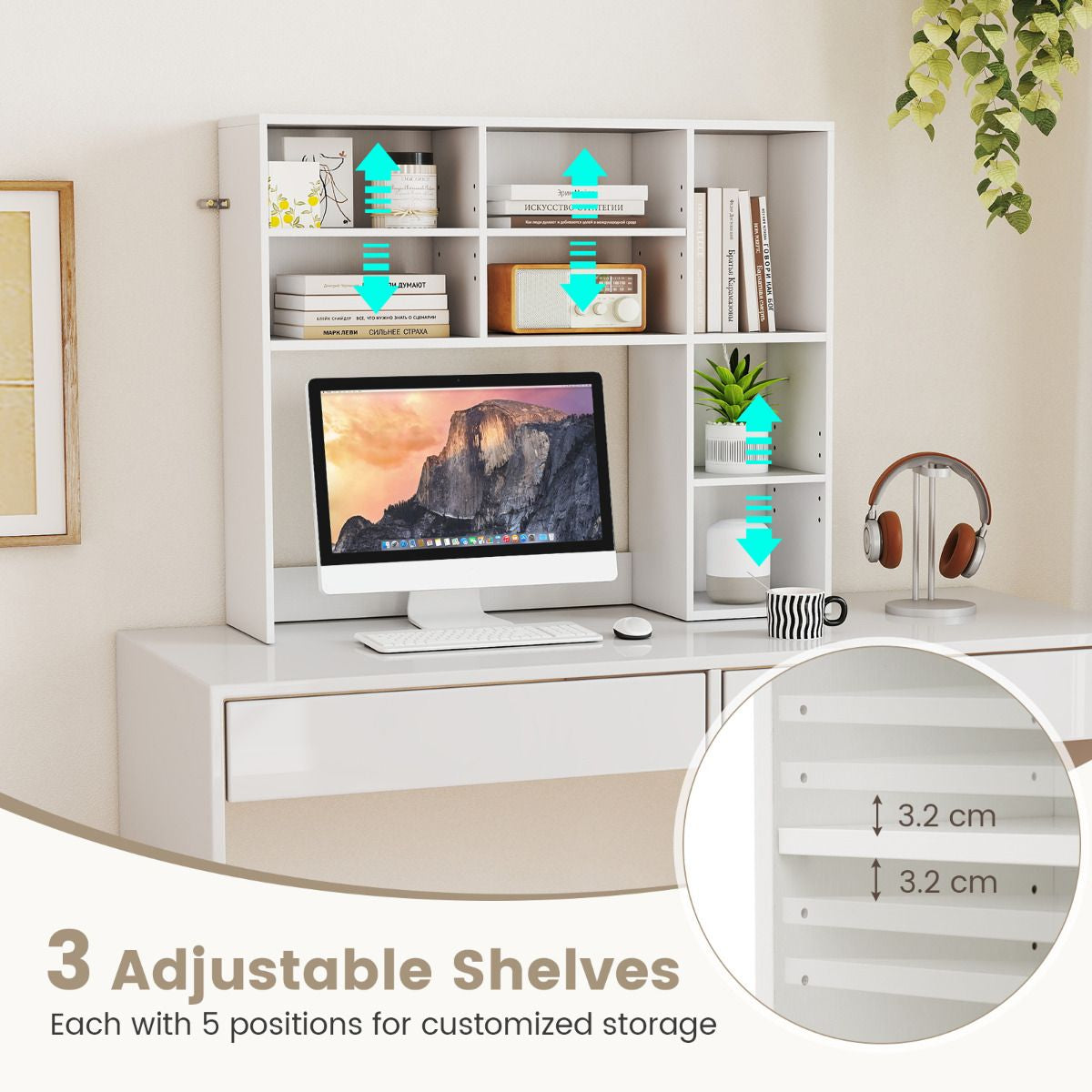 Customize Your Storage: Say goodbye to one-size-fits-all shelves! With three 5-position adjustable shelves, you can easily tailor the storage organizer to fit different sized items like books, photos, potted plants, and other decorations, making it the perfect addition to your personalized workspace.
