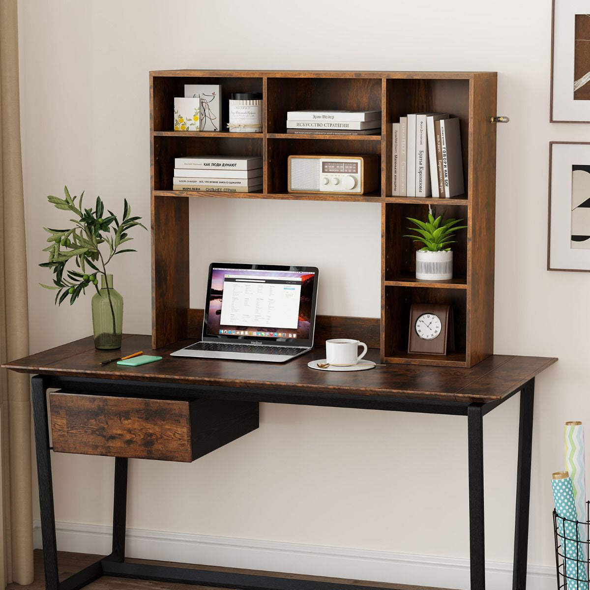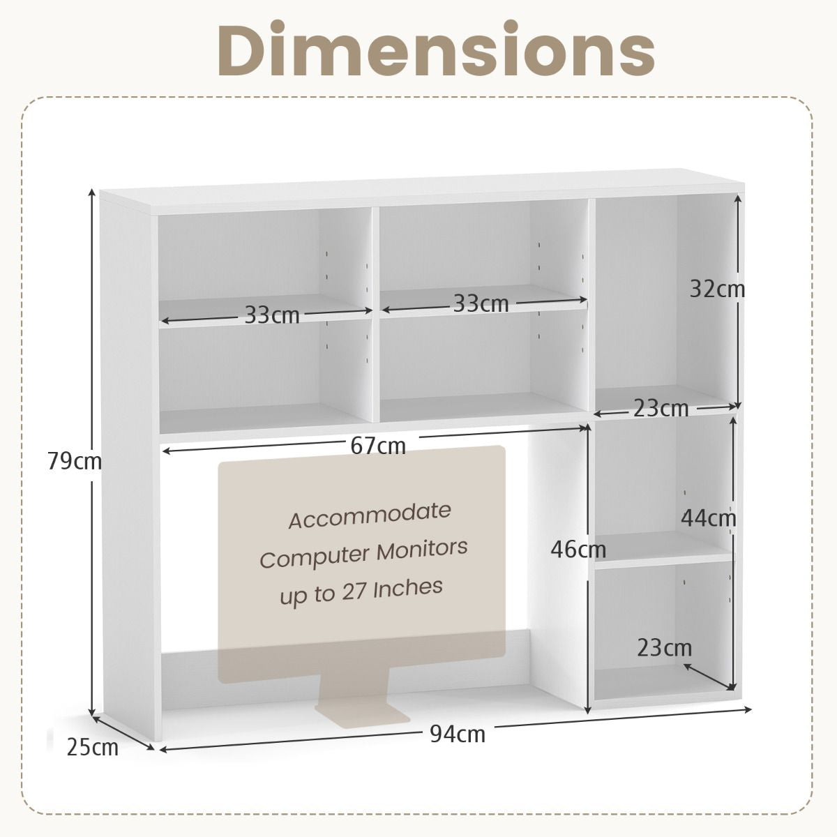 Maximize Desktop Space: Tired of cluttered desks? This desk hutch shelf features a vertical structure with an open-back compartment for computer monitors up to 27", freeing up precious tabletop space and keeping your workspace tidy and organized.