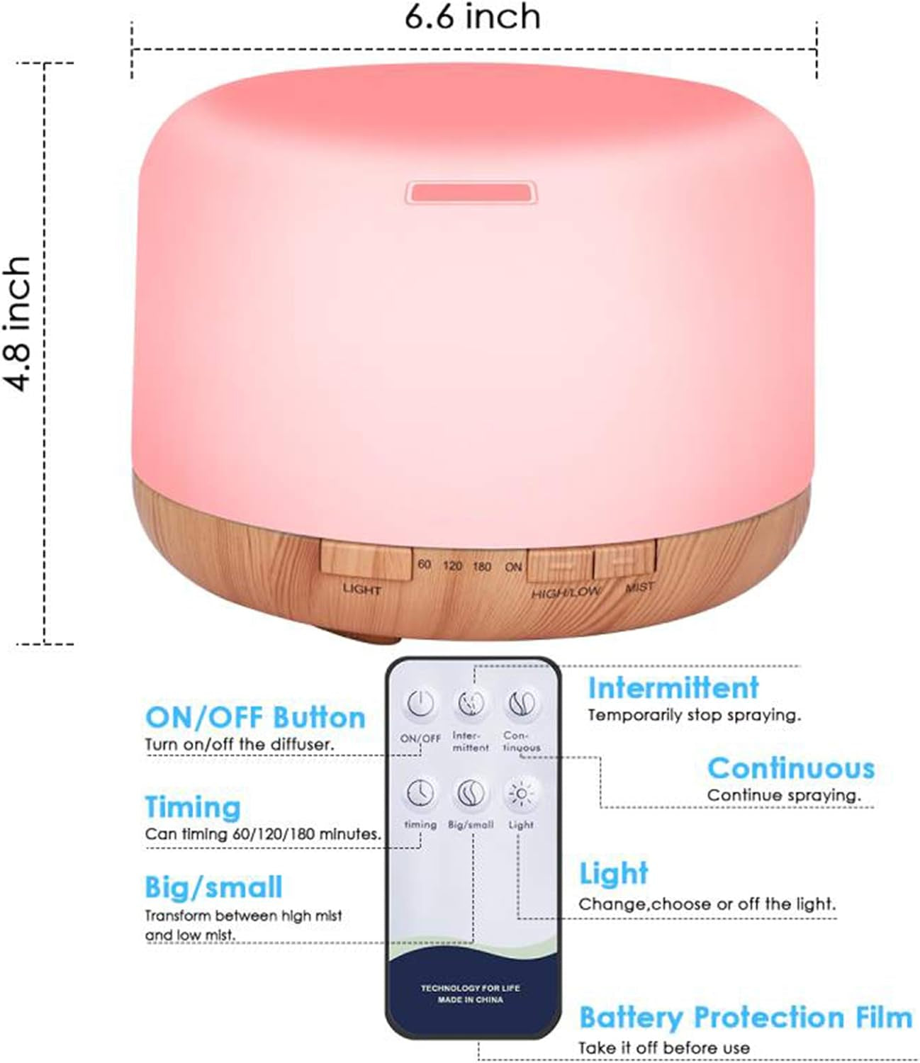 - 【Remote Control Diffuser】 You can easy to set Time mode, Mist mode and Light mode by this remote control. Run steady and noiselessly, give you a quiet and comfortable environment.