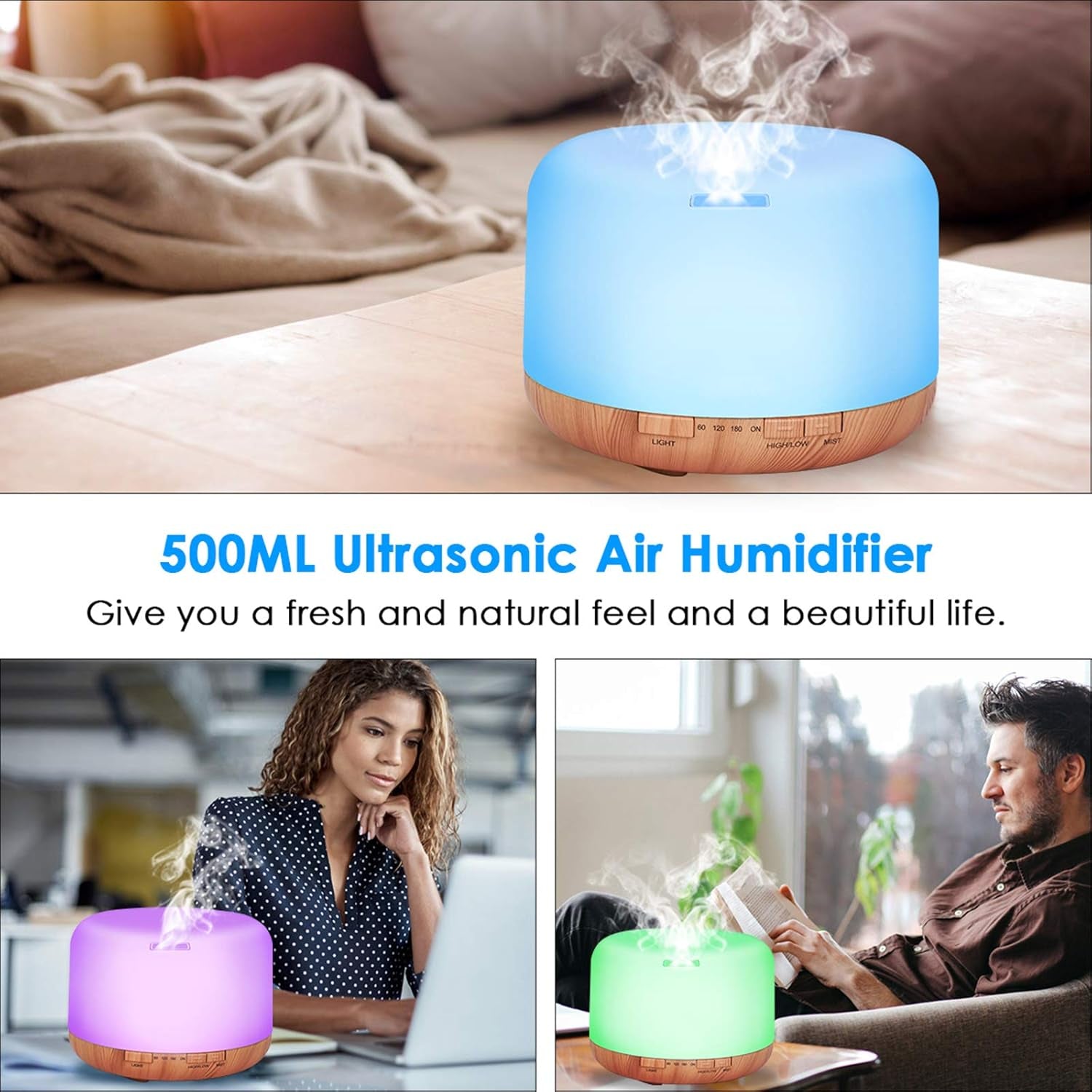 - 【Large Tank】Large 500ml water capacity that can continue use up to 10 hours each time. 4 timers: 60/120/180/continuous modes, High/ Low modes as you choose. Protect you family from excessively dry air!