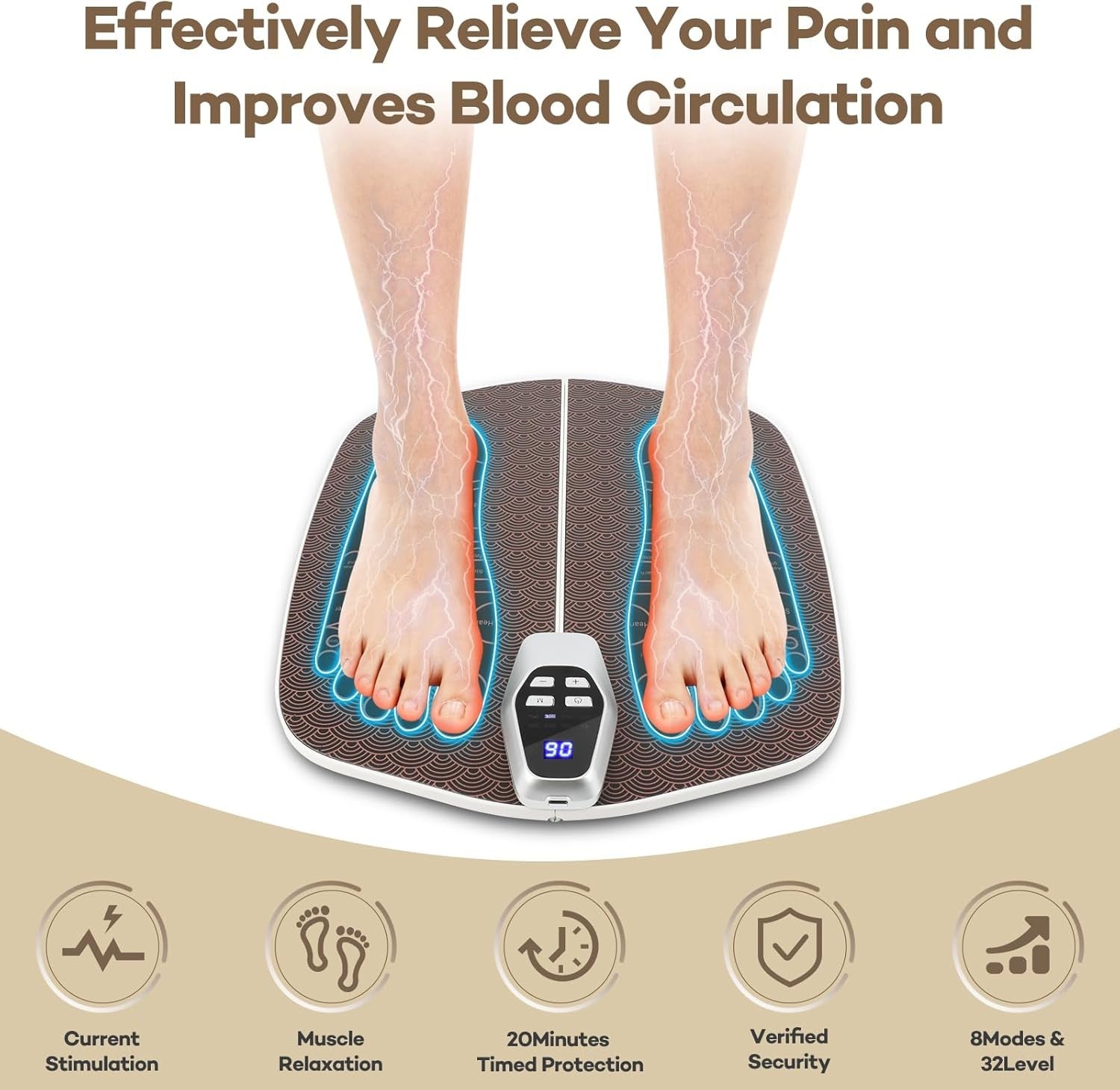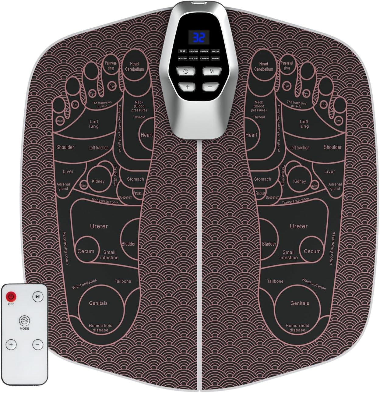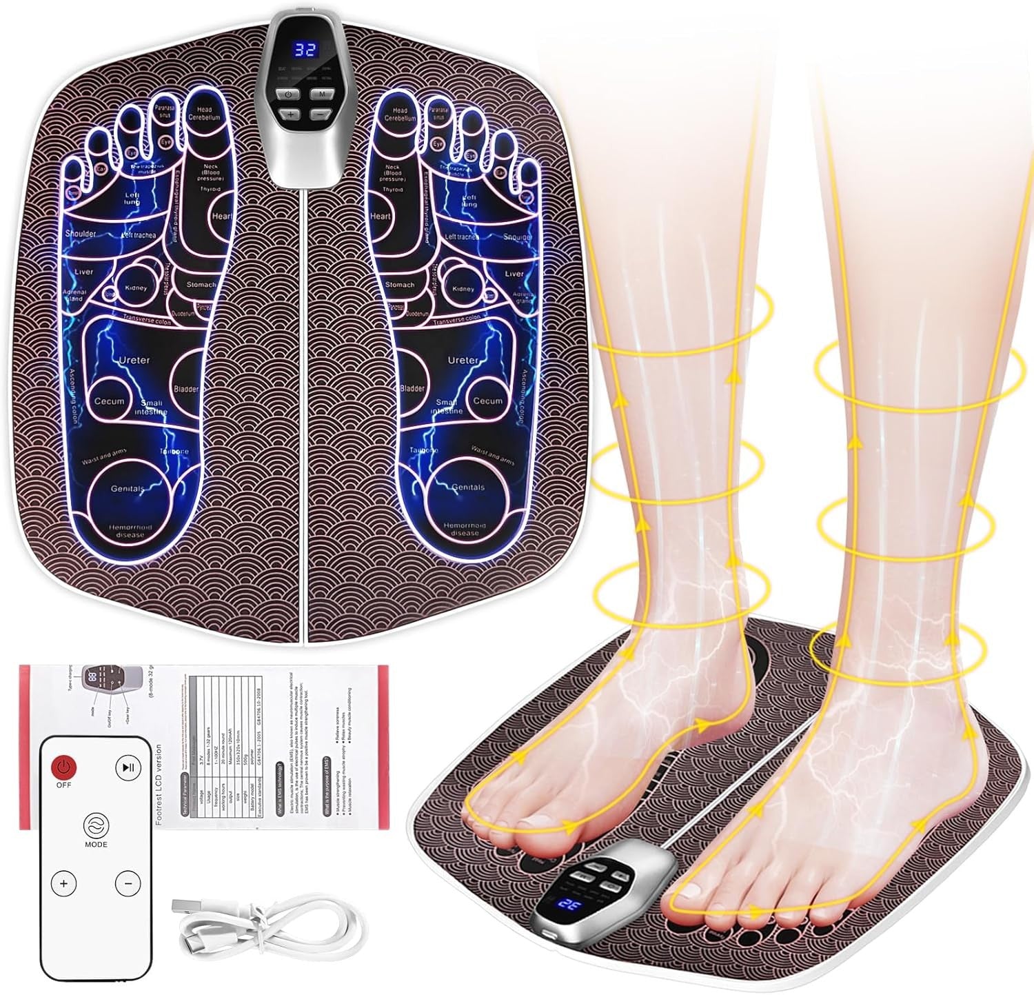 Features: -Made of ABS material, it is easy to clean, durable, not easy to deform or be damaged, ensuring a long service life. -With 32 levels, starting from low intensity, you can choose the ideal setting to achieve the best relaxation effect. The default setting is a 20-minute cycle, and it is recommended to use up to 3 cycles per day for optimal relaxation. -It provides 8 modes to meet your specific needs (hammering, massaging, kneading, shaping, squeezing, patting, activating, comprehensive), providing deep massage technology, effective pain relief. -EMS technology helps improve blood circulation, reduce swelling, relax tense muscles in the feet, relieve fatigue, pain or stiffness, and improve overall foot health. (Note: not suitable for patients with pacemakers, heart disease, epilepsy, etc.) -Small and portable, so you can enjoy a foot massage anytime, anywhere.