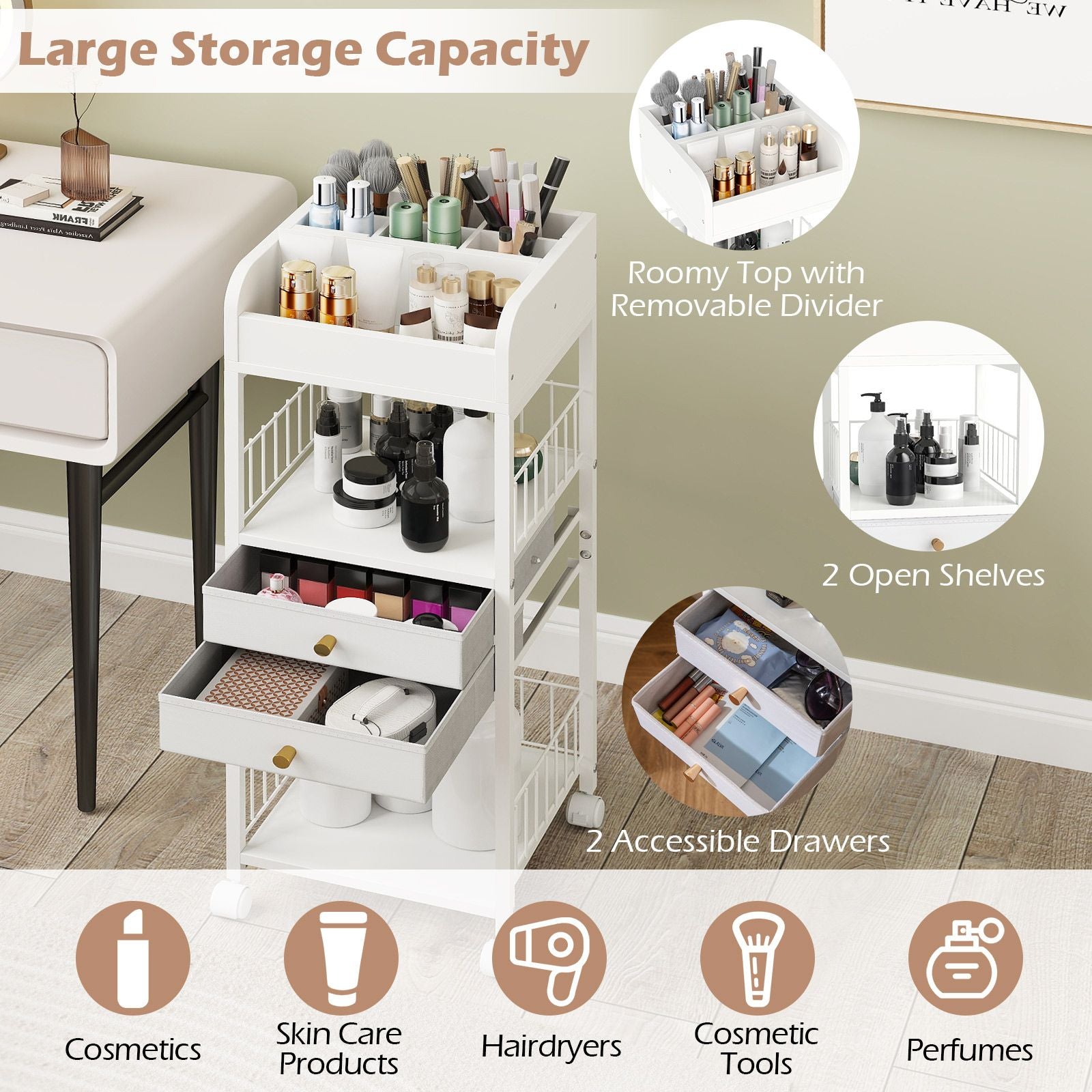 Elaborate Organization Layout: The makeup organizer features a top divisional cosmetic display case for easy access to frequently used items. Below, 2 slide-out drawers and storage shelves provide classified storage space for skincare, cosmetics, beauty products and hair accessories.