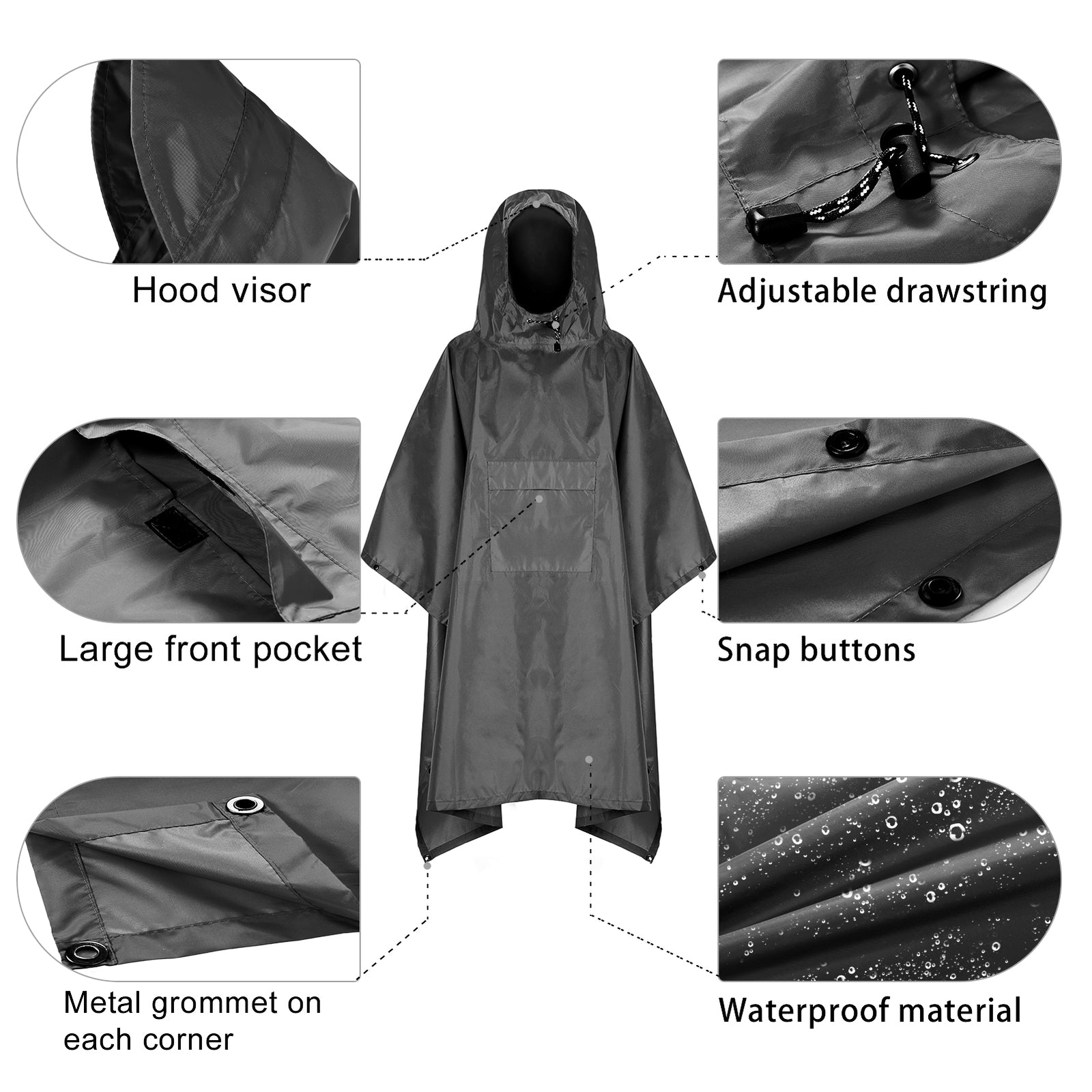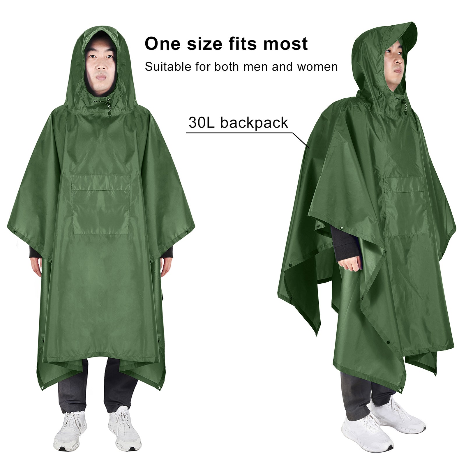 This rain poncho is carefully crafted from lightweight and polyester fabric, and water proof taped seams at the backing to keep you dry in rainy days. It is designed with a built in brim and adjustable drawstring on the hood, snap buttons on both sides of the poncho to provide secure conservation. The big pocket on the front helps store your personal items conveniently. The metal grommet can be used with your poles to set up the rain poncho and use it as a sun shelter. Besides, you can lay the rain poncho flat on the ground to serve as a picnic blanket, very useful for your outdoor activities. When not in use, just fold it up and stuff into the sack for easy storage and carrying, great choice for camping, hiking, Cycle, mountaineering, traveling and other outdoor activities.