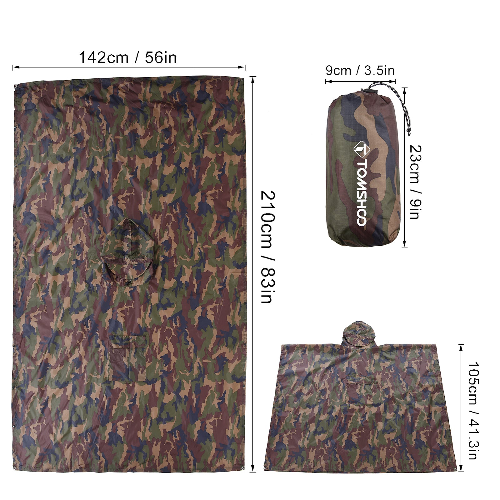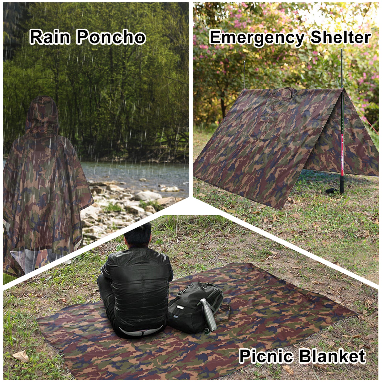 Can be used as a rain poncho, sun shelter or picnic mat.