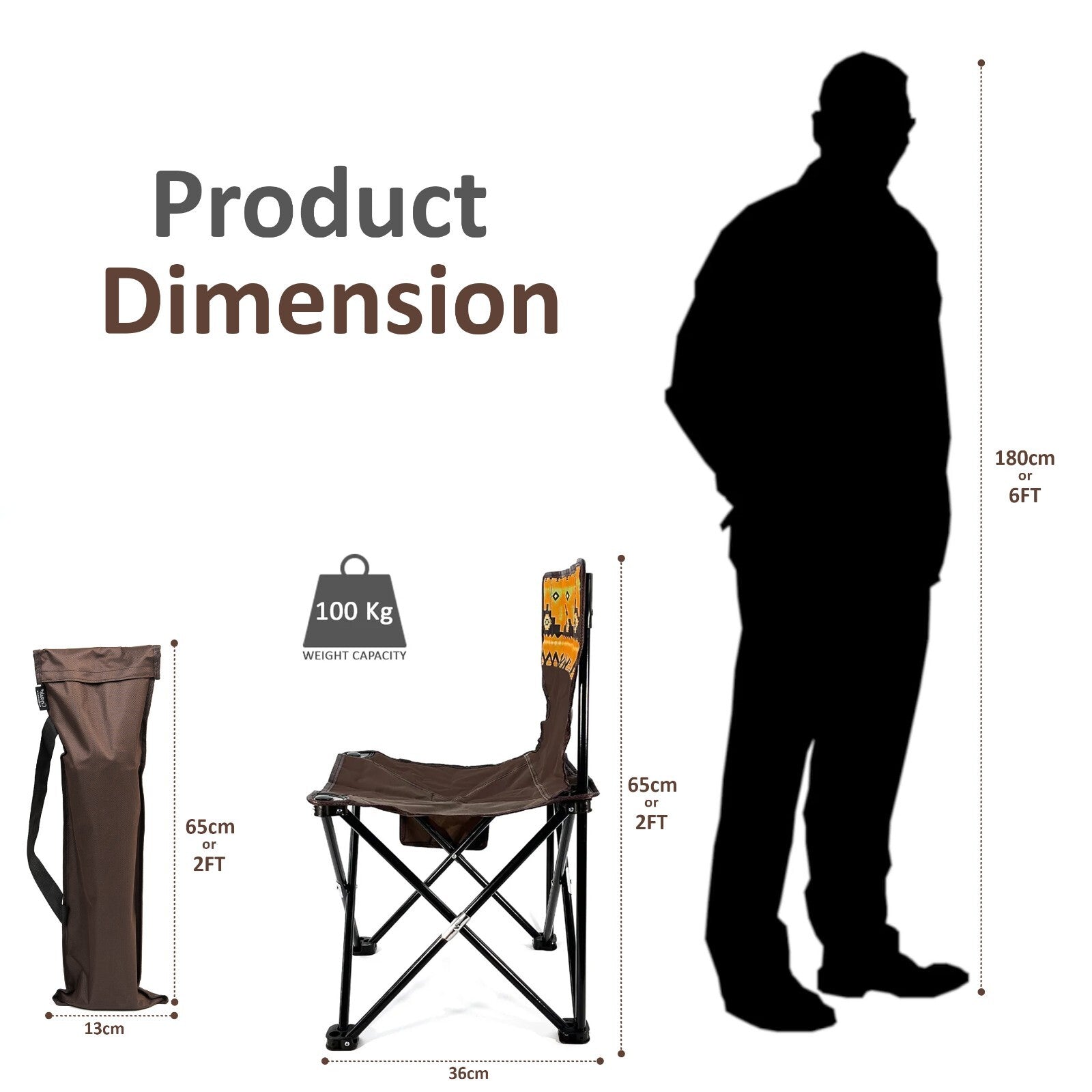 - The chair has an easy-fold design which allows you to set it up and pack it away in seconds. When stored inside the drawstring bag included, and measures H65cm x W13cm x D13cm (approx.). The bag has a strap to comfortably sling over your shoulder and carry on outdoor adventures.