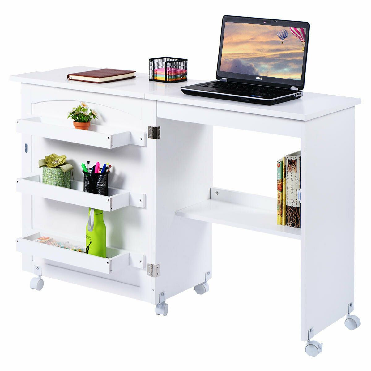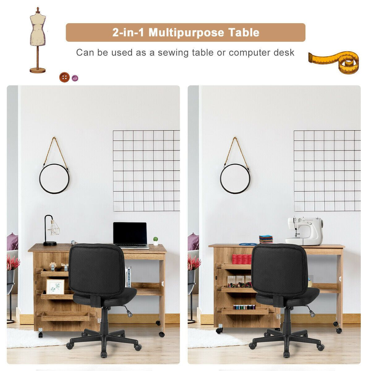 The multifunctional sewing table can not only be folded for saving space but also offer you adequate storage space. When the table is unfolded, you will get a practical sewing table or a working table. When it is folded, you will get a storage cabinet that can be placed in a corner. If you are looking for a 2-in-1 rolling craft table like this, do not hesitate to place an order!