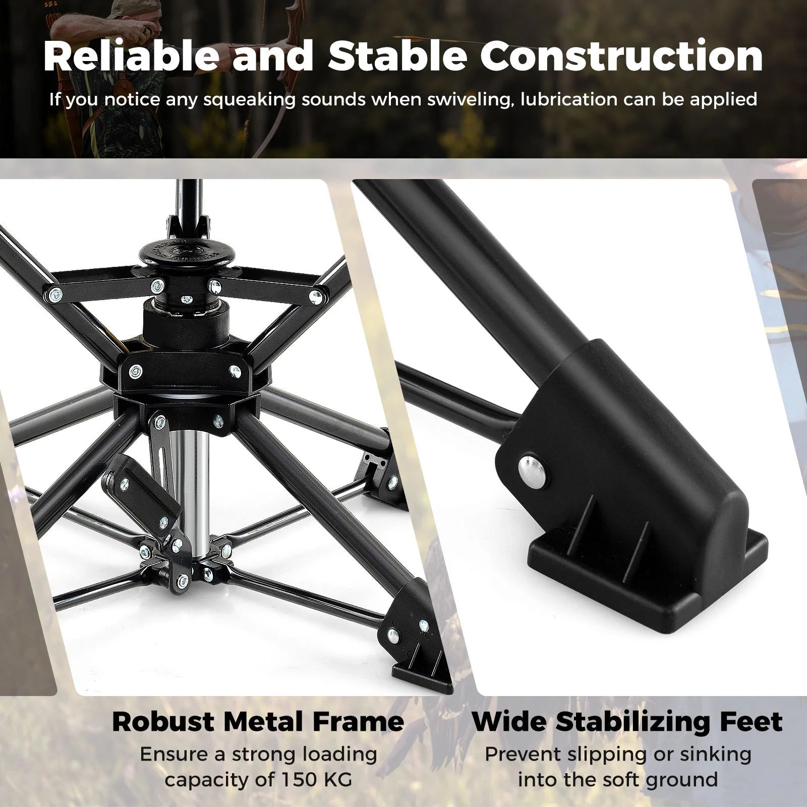 Rugged Oxford Seat: Crafted of 600D thick oxford cloth with camouflage patterns, the stool seat is wear-resistant, tear-resistant, waterproof while staying concealed, ensuring it holds up against the rigors of outdoor use. Note: If you notice any squeaking sounds when swiveling, lubrication can be applied.