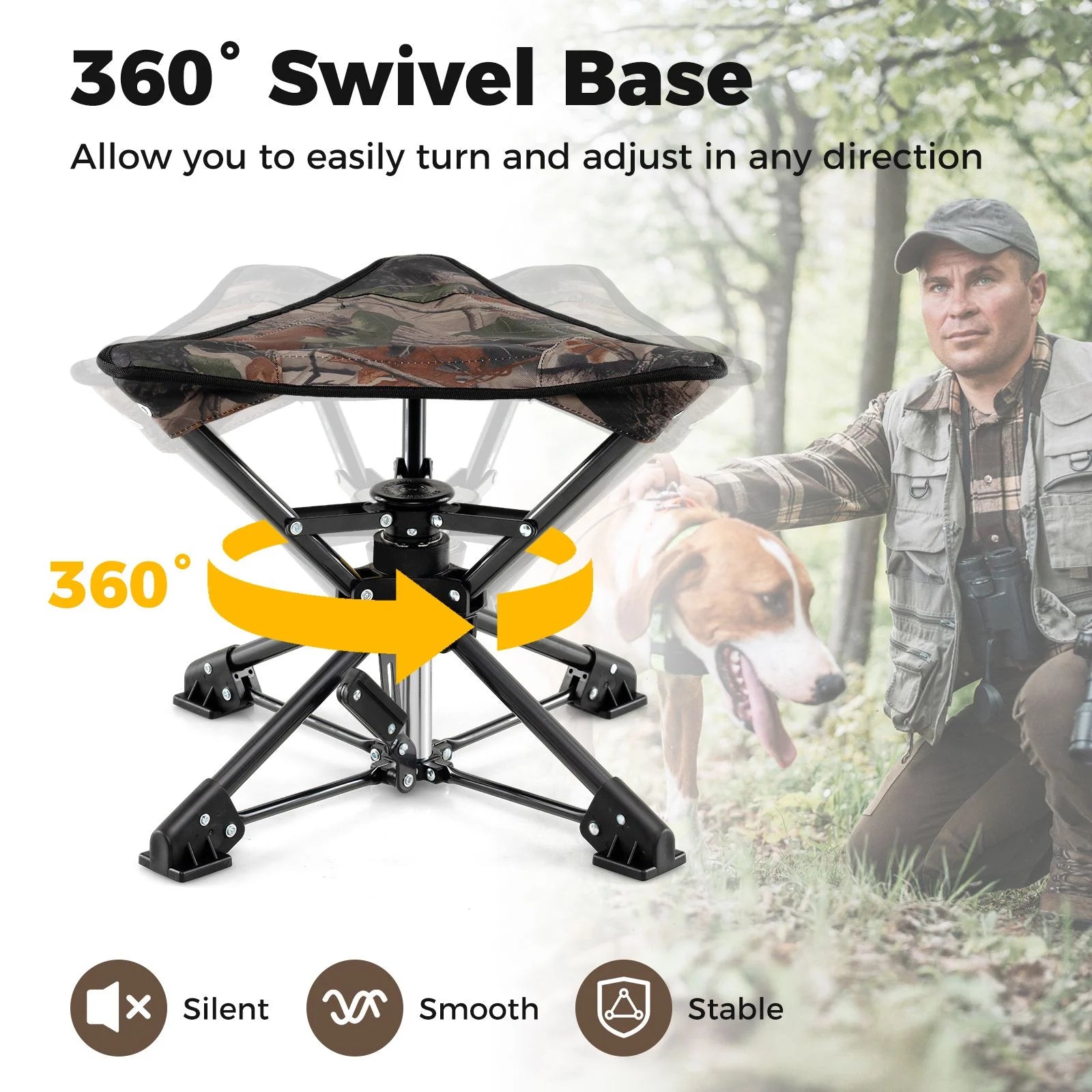 The folding tripod camping stools boasts a 360° flexible rotating base that ensures a smooth and quiet movement, allowing you to easily turn and adjust in any direction. It is built with a sturdy metal frame and reinforced with 4 wide stabilizing feet, ensuring a stable and reliable seating option on a variety of terrains. Plus, the 600D oxford seat is both waterproof and tough enough to withstand the rigors of the outdoors, ensuring long-lasting performance, and features a stylish camouflage pattern perfect for outdoor enthusiasts. Folding and unfolding the stool is a breeze, simply press or step down to collapse it, and slip it into the included carrying bag for easy transportation and storage. Ideal for camping, fishing, hunting, and attending outdoor events, this portable stool combines convenience, comfort, and versatility to meet the needs of adventurers and casual users alike.