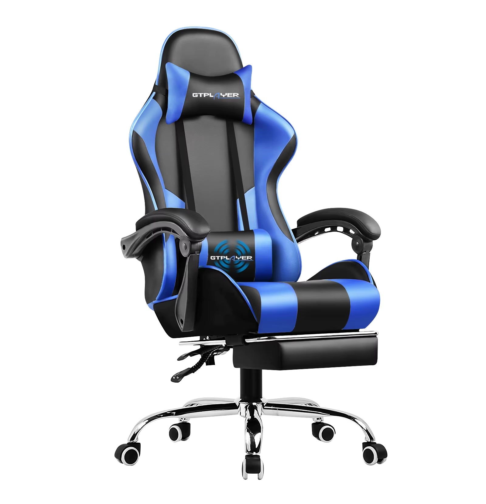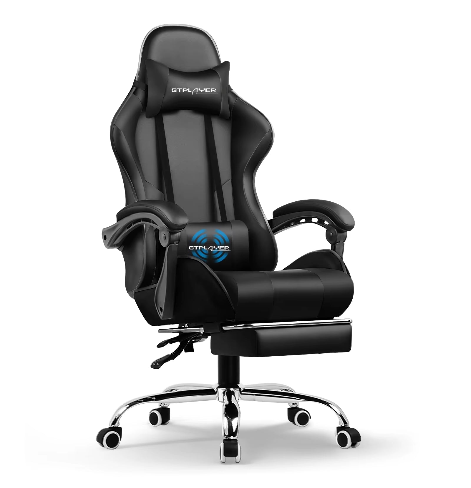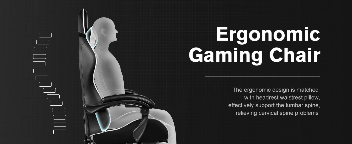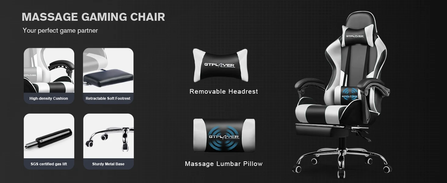 【Comfortable and Relaxing】 After multiple measurements and calculations, GTPLAYER crafted this ergonomic frame of gaming chair which fits human spine curve better. 2 Adjustable pillows together created a personlized fully support for your neck and back. With extra padded seat cushion you will forget time when sitting on this computer chair. And don't forget our unique massage lumbar pillow which will help you to relieve the pain in waist and back.