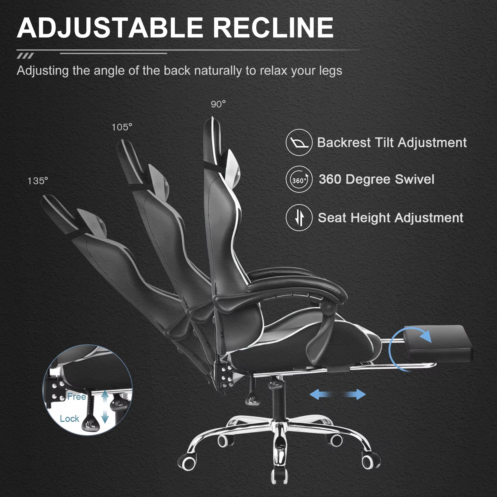 【Multi-Adjustments】 10cm Height Adjustable makes this gaming chair suitable for children, teenagers and adults; 90° - 150° Reclining Backrest adapts your different position; 360° Swivel Seat and Multi-direction Silent Caster together helps you to rotate and glide free as you like; Electronic Massage Lumbar Pillow; Retractable Footrest; Head Rest; Linkage Armrest.