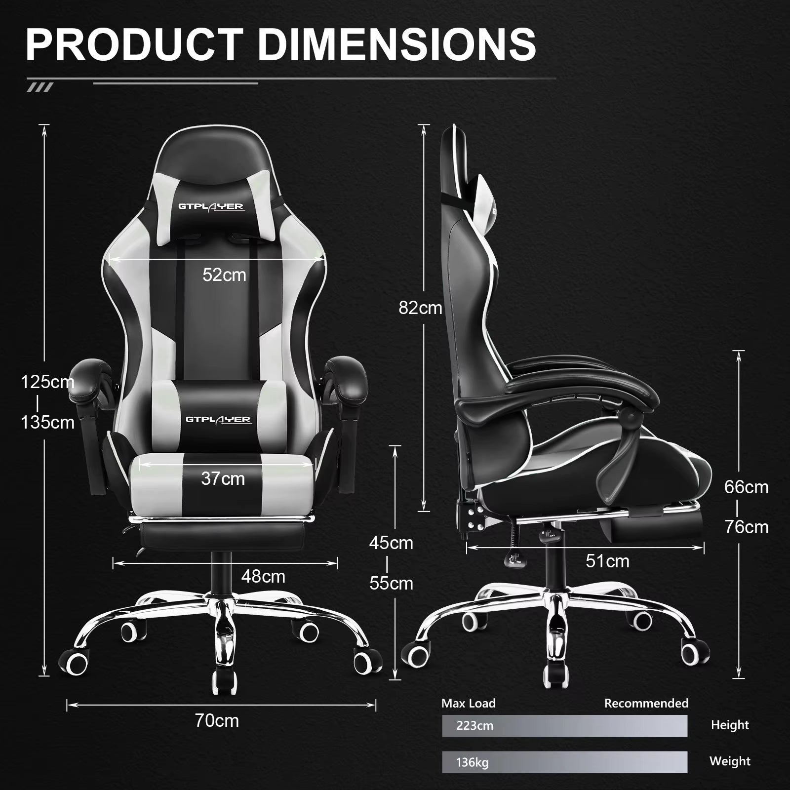 【Footrest】 You could pull out the retractable footrest and take a nap in game breaks. The linkage armrests will always support your albows at any angle. This gaming chair is ideal for enthusiastic gamers and long-time sitting workers. Dimensions: 26.77"(L) x 26.77"(W) x 48.81"-52.75"(H); Sitting Area Dimensions: 19.68''(L) x 19.68''(W); Maximum Weight Capacity: 300 pounds.