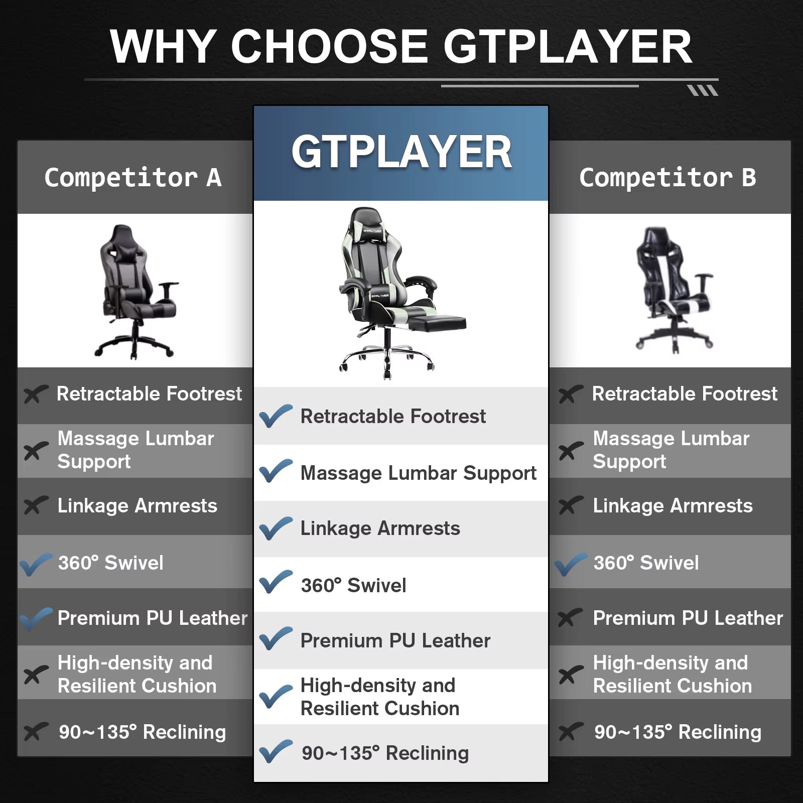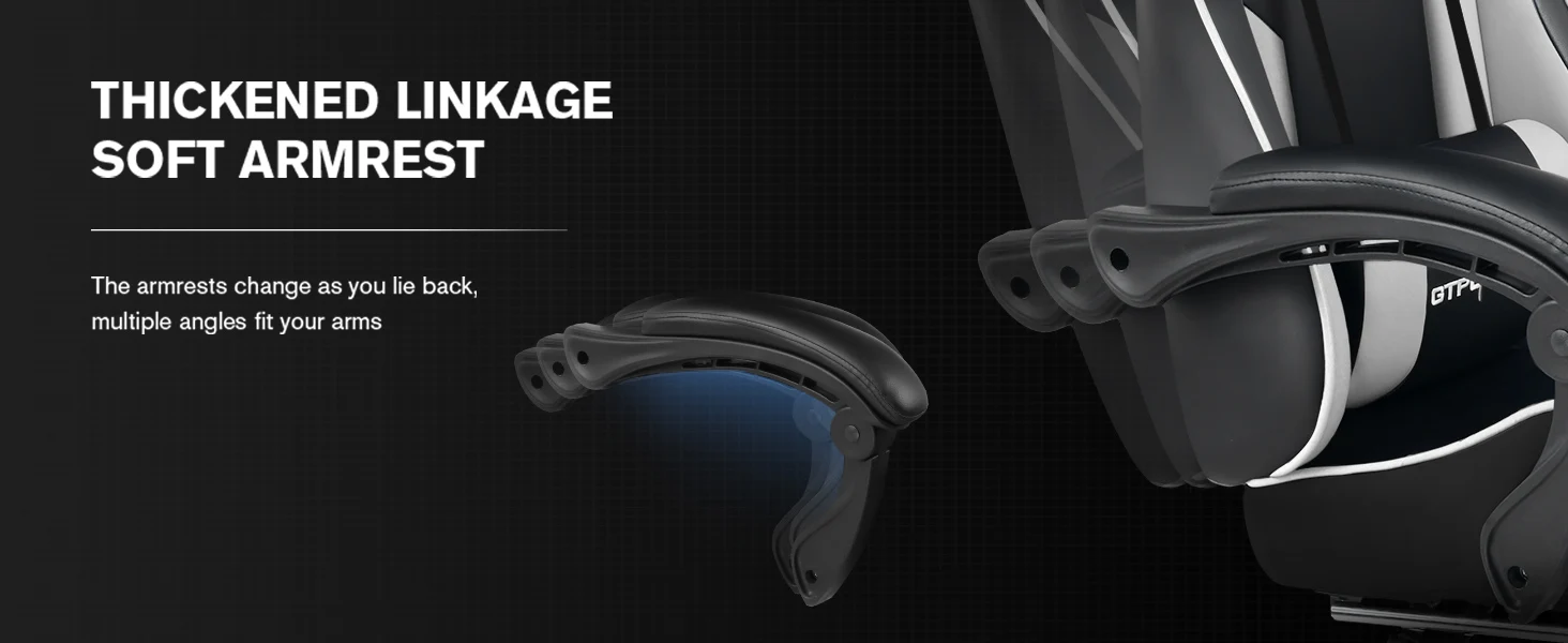 【Better Sitting Experience】 This computer gamer chair is crafted from high-quality tear resistant and wear resistant PU leather, boasts a skin-friendly soft material that resists scratches, stains, peeling and cracking while being highly breathable. The GTPLAYER gaming chair is also padded with high-density cold molded foam to provide long-lasting comfort, ensuring that the chair retains its form even after extended periods of use.