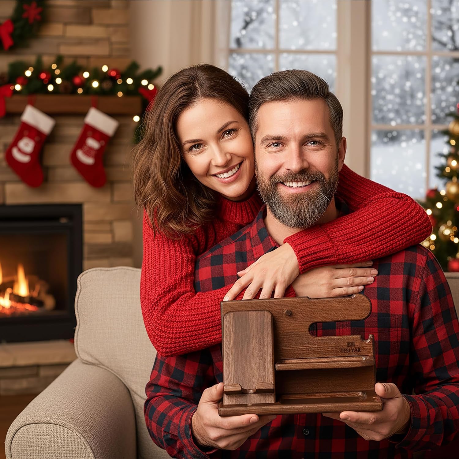 Gifts for Men Wood Phone Docking Station Desk Organizer Fathers Gifts Gifts for Him Xmas Gift Anniversary Birthday Presents Nightstand Key Wallet Stand for Men, Boyfriend, Dad